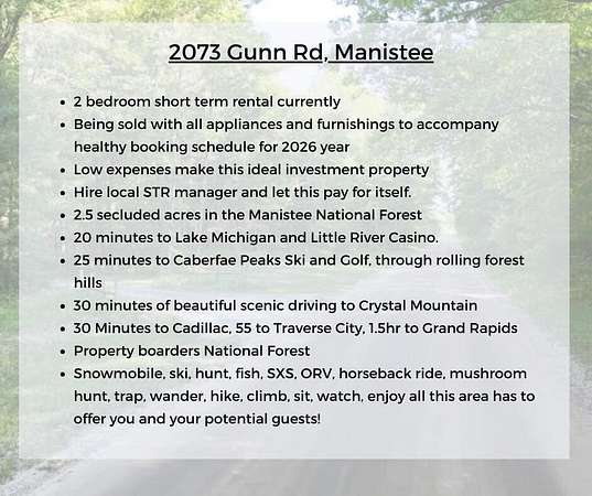 Where peace and quiet meets a bustling business, step onto this 2.5 acre parcel situated in the heart of the Manistee National Forest. Approx 20 miles from Lake Michigan. Pull out the driveway and find yourself on the trails, wonderful for hiking, ORV, horse rides and snowmobiling. This home was completed in 2023 laid out with open kitchen and living room and a covered porch off the front. Green views surround this home currently functioning as a rental, bringing in 20k+ last year in bookings with relatively low annual expenses. This property already has 60 nights booked for the coming season, all of which a new owner could capitalize on IF they wanted to. Being sold with everything included from bookings to linens-step into management today or a turnkey primary residence or second home. Contact your lender and see how you can use this projected income to help you qualify for the loan to purchase!