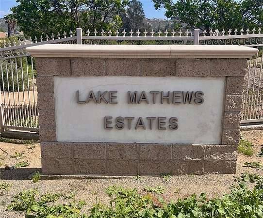 This is "The Ledge" at Lake Mathews Estates! 7.2 acres in the most prime location where each day you wake up and exhale and enjoy the views from the "top of the world". Privacy and exclusivity and space are the earmarks of this wonderful location. All of Lake Mathews, the pristine lake, lies below. The lot gently slopes down so no one will ever ever obstruct your view. The owners had dreams, but life pointed them in another direction. The lot is graded for a split level home, blue prints and all. There is a producing water well and septic with great leach lines already in. The plans can be enlarged or reduced, depending upon your preferences. You will see the lot has been roughly graded to take full advantage of the vantage point. This area is paved and peppered with multi-million dollar homes, most of which are invisible behind substantial estate gates.