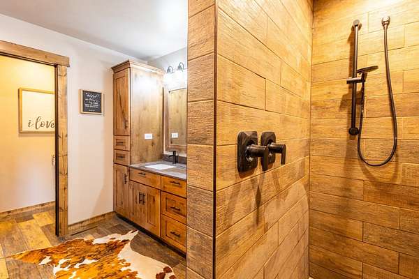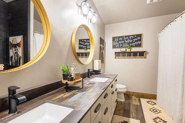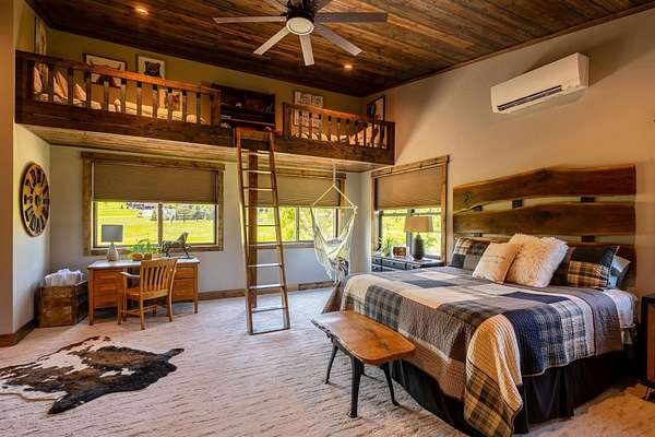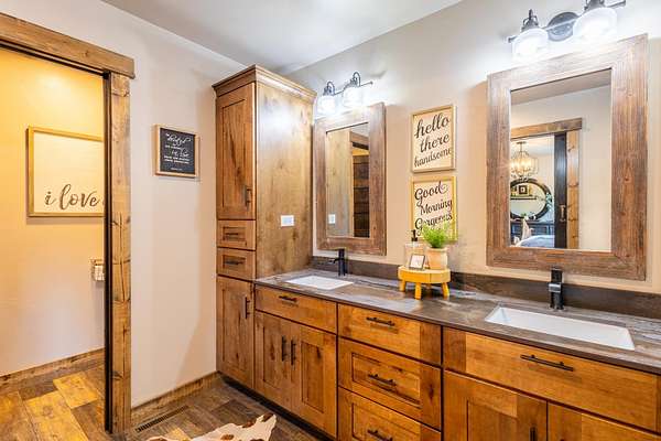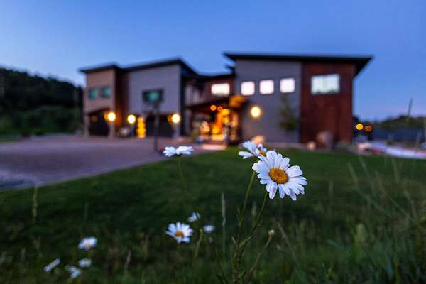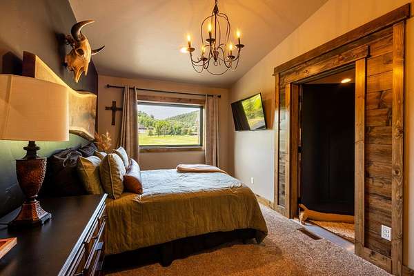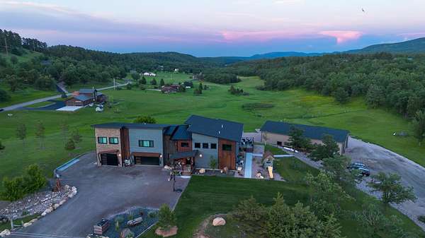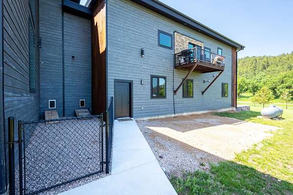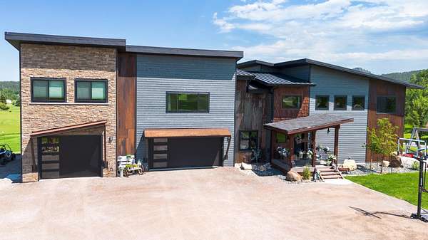 For more information, please contact listing agents Scot Munro 605-641-6482 or Heath Gran 605-209-2052 with Great Peaks Realty. Nestled on 5.25 acres with a wandering seasonal steam, this stunning home filled with gorgeous finishes and custom details is tucked among a desirable neighborhood with easy central access to everything in the Northern Hills. The main level features a spacious living room with vault plus floor to ceiling windows, a gas fireplace, and hand-selected lighting that creates a warm and inviting space. The spacious primary suite includes a dual-sink bathroom and tiled step-in shower. The kitchen is a dream with granite countertops, pull-out shelving, a corner pantry, and a large sliding door that opens from the ample-sized dining room out to the covered deck - all of which is great for gatherings. The deck is surrounded by vast views and a built-in salt-water hot tub. Convenience is added by the charming half bath with a farm sink and unique flooring, plus main floor laundry and a huge entry room for coats & shoe storage. Plus, electric blinds on the windows! As a bonus - the main level of the home was built with some extra space & wide doorways, to be nearly ADA ready. Upstairs, a lofted sitting area doubles as the office space; plus, you'll find two bedrooms, a full bathroom, and access to a private lock-out apartment that is a lucrative Short-Term rental.