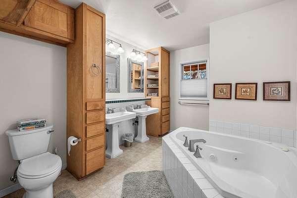 - Double Vanity, Fiberglass Stall Shower, Laminate Counters, Primary Downstairs, Shower/Tub Combo, Soaking Tub, Tile Counters, Tile Shower, Vaulted Ceiling(s)