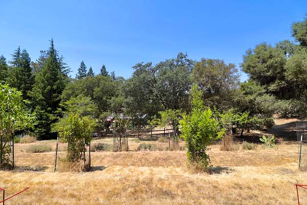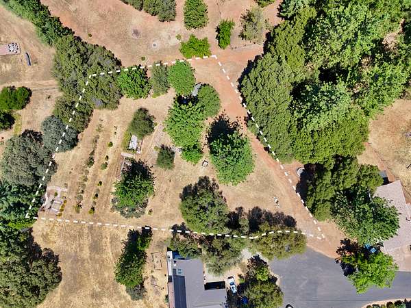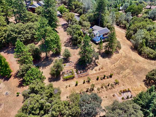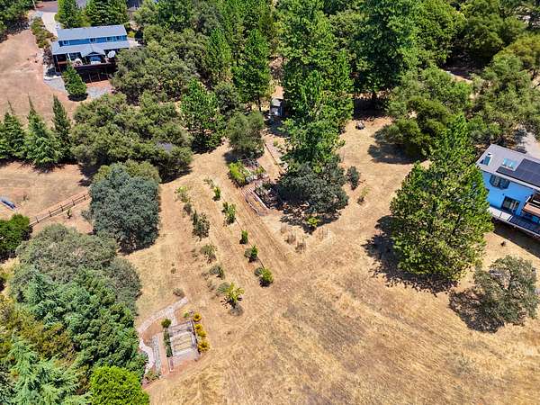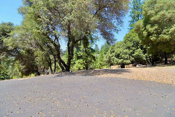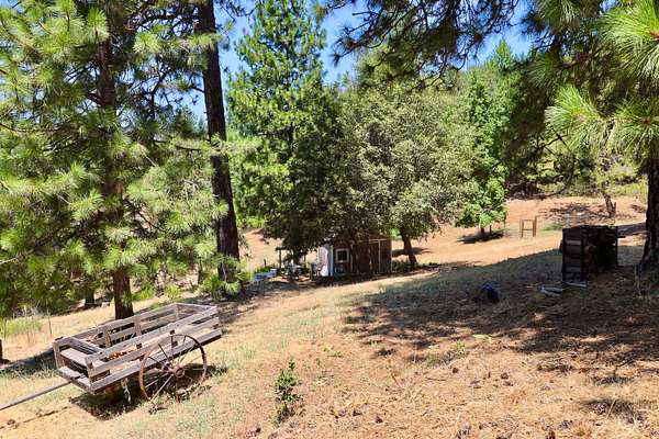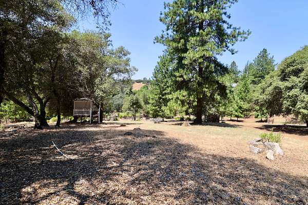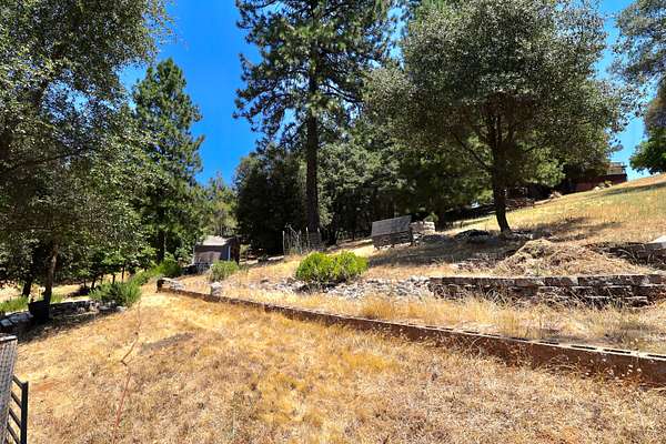 Build ready property in Cool California with a water meter already installed and completed house and septic plans included. This peaceful parcel in Auburn Lake Trails features a terraced garden, a shed, firewood storage, an antique wagon, and a seating area, creating a charming outdoor setting surrounded by trees and gentle terrain.