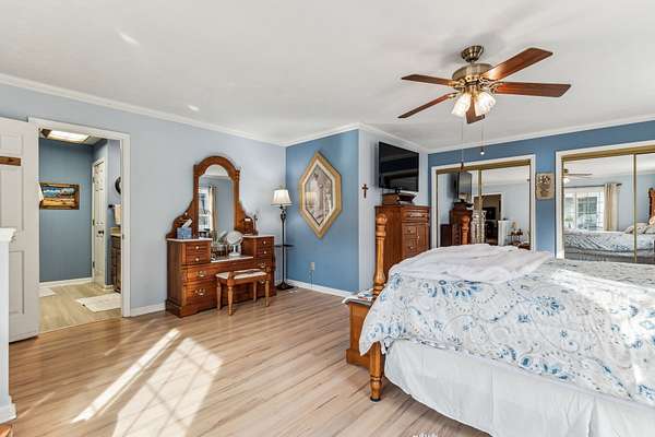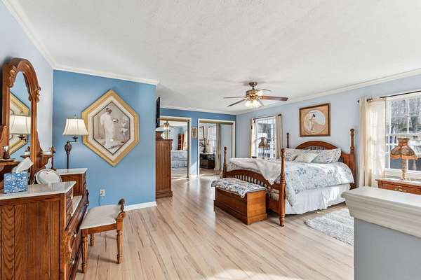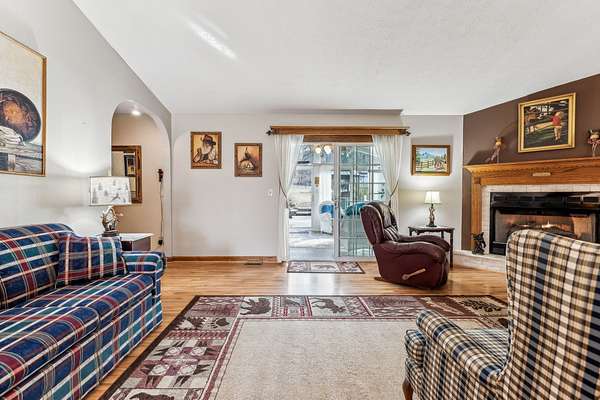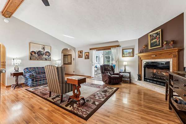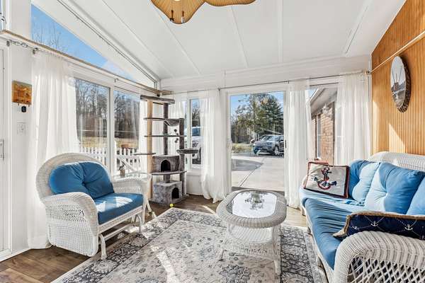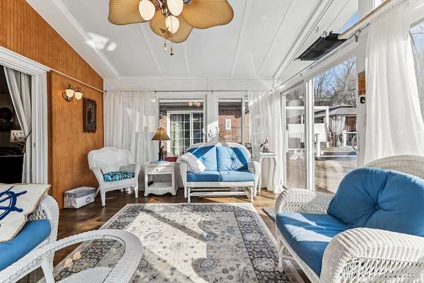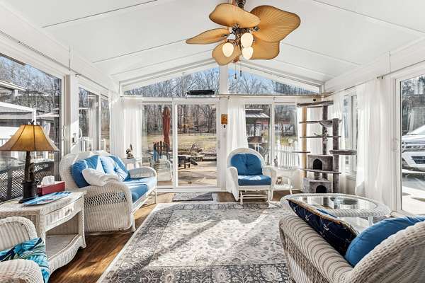 Inside, a heated & cooled sun porch surrounded by glass provides the ultimate spot for evening relaxation. The family room boasts a walk-up bar, while the cozy den offers a fireplace with gas logs--perfect for enjoying the big game or a card night. The spacious primary suite includes a walk-in tile shower, abundant closet space, and private access to the deck.