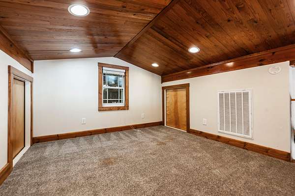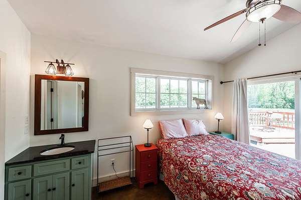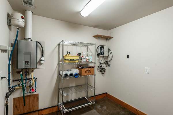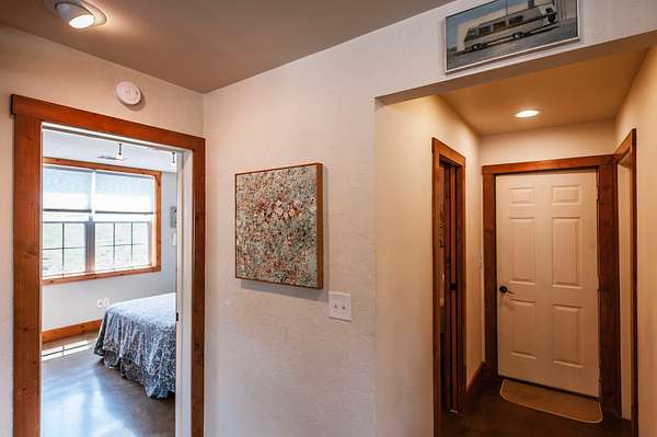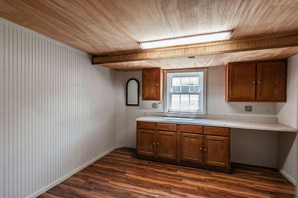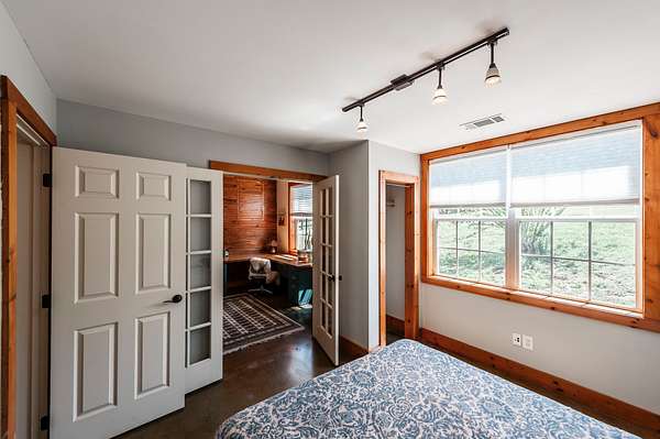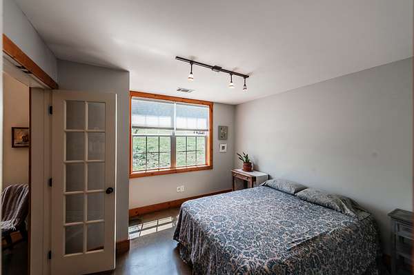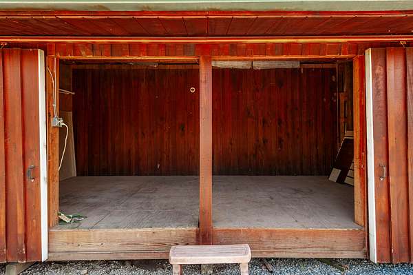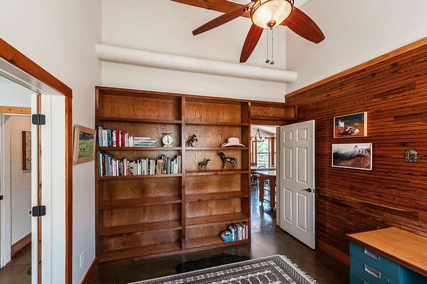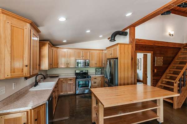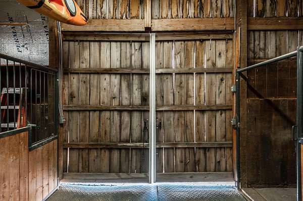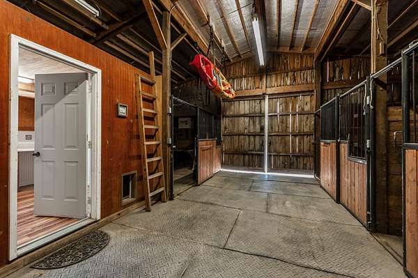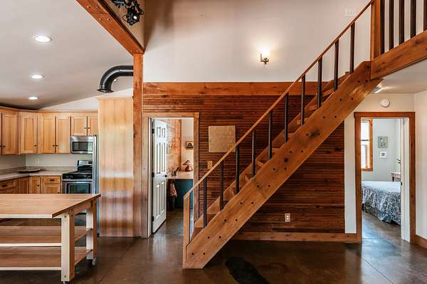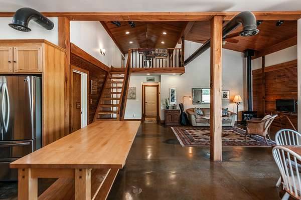 Step inside to a spacious main living area filled with natural light, soaring ceilings, stained concrete floors, and exposed ductwork that give the home a striking industrial edge. Wood walls feature upcycled wood from the original Foxland Hall Horse Barn, originally on the Foxland Harbor property. Toward the back, you’ll find an additional flexible space, ideal for an art studio, guest quarters, or extra storage, alongside the original barn structure that adds even more character and functionality.