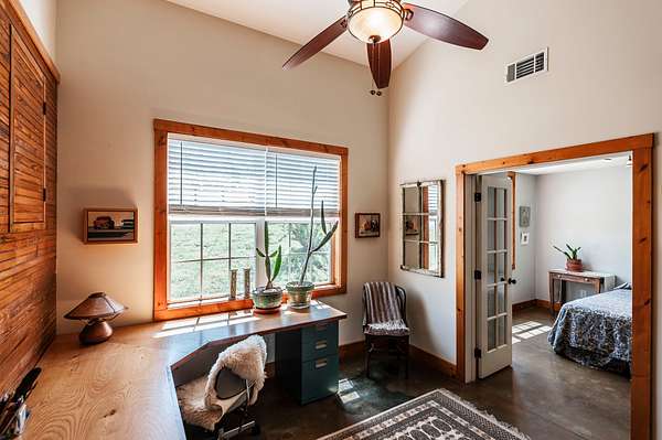 Perfect for creatives, hobbyists, or anyone craving a one-of-a-kind retreat, the property is fully equipped with stables for horses, a chicken coop, and ample space for hay, feed, and storage. The home itself features 2 bedrooms, 2 full bathrooms, and a dedicated office that could easily serve as a 3rd bedroom.