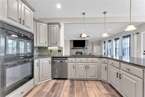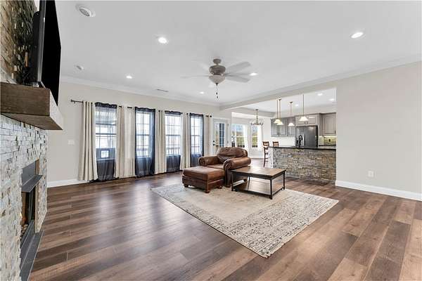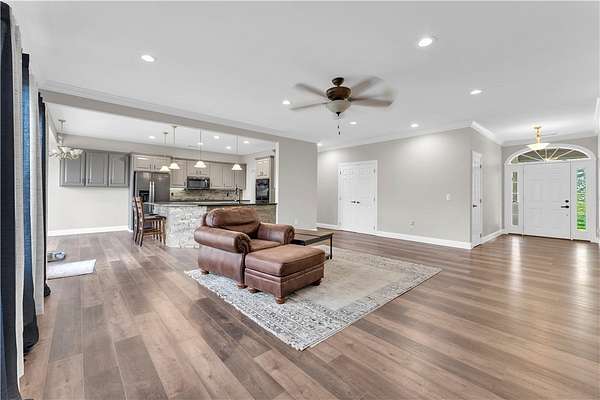 This stunning home sits on over 3 acres and offers breathtaking views you won't want to miss. With over 4,300 square feet, the property features 5 spacious bedrooms and two full kitchens, perfect for multi-generational living or added flexibility. The fully furnished basement provides its own private living space with its own private attached two-car garage, which is ideal for a mother-in-law suite, apartment, or potential Airbnb opportunity. Upstairs, you'll find a desirable split floor plan, generous walk-in closets, and both formal and informal dining areas designed for everyday living and entertaining. Enjoy peaceful mornings or relaxing evenings on the oversized front porch, all while being just a block away from Oakridge Golf Course.