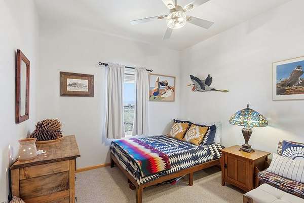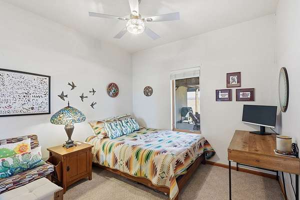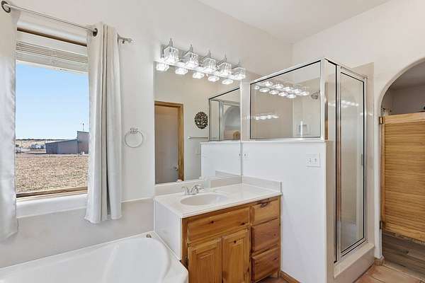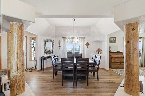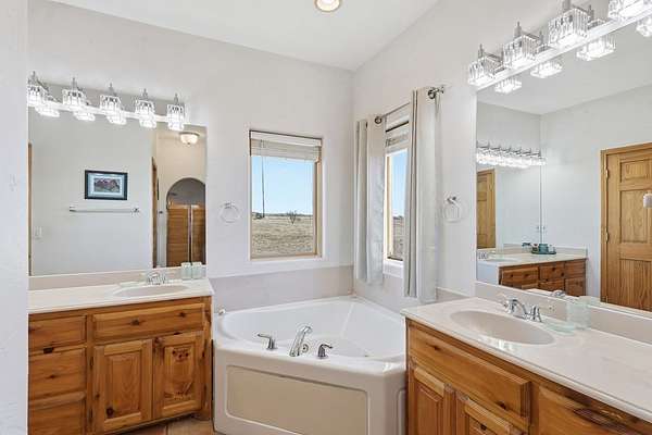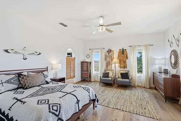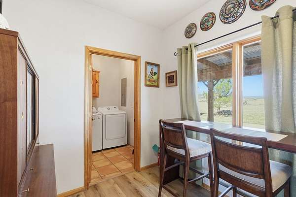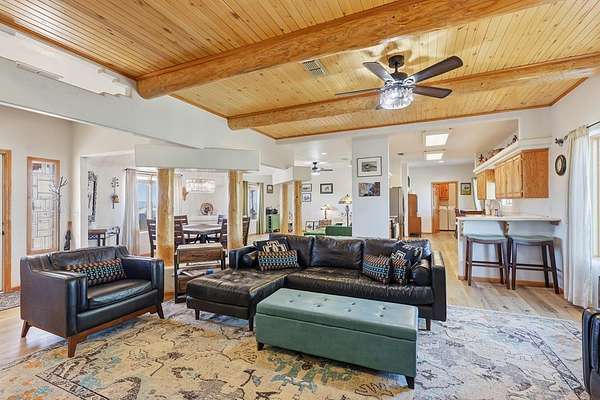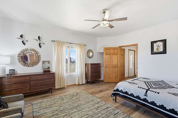 Est $2,328/moElegant Pueblo Revival style home on 3+ acres surrounded by 360 degree mountain views! This 2,122 sq ft home includes 4 bedrooms, 2 bathrooms, formal living with kiva fireplace and wood beam ceiling, formal dining and study/den. Laminate floors, high ceilings, pine pillars and lots of tasteful southwestern touches. Fenced yard, 2 car garage and separate 832 sq ft storage/shop. Sequestered master bedroom & bath w/jacuzzi tub and separate shower. Don't miss seeing this one!