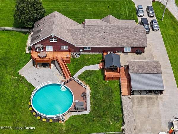 Welcome to your own piece of paradise. This ten acre hobby farm is ready for its next owners. An expansive and thoughtfully updated all brick home sits at the front of the property. The covered front porch greets you through the front door where you enter into a large, open concept living area with vaulted ceilings and bright natural light. An oversized granite island is the perfect gathering place for entertaining or casual eating. Follow the beautiful floors down the hallway to find the five bedrooms. The primary suite is at the end of the hall and features a spa like bathroom with a soaking tub and separate shower. It has dual vanities with ample cabinet space and a walk in closet. This bedroom also has a spiral staircase leading to a large loft area. This area is great for a home office or sitting area. Because this space can also be accessed through another staircase, it could easily be closed off from the primary to make a fun game room or even a sixth bedroom. In addition to three other bedrooms, the home features a second primary with an ensuite bathroom and walk in closet. This is perfect for an in-law or guest suite. The finished walkout basement is a space to play...whether it's watching movies, playing pool, or hanging around the bar, there are plenty of options. Out the backdoors are two decks and a patio overlooking your ten acres of land ideally suited for horses or other livestock. With multiple barns and garages, there are plenty of storage options. There are three horse stalls and a tack room. Please see attachment for details of buildings. Rounding out the property is a driveway big enough to accommodate many cars. Take the time to visit this lovely and unique homestead.