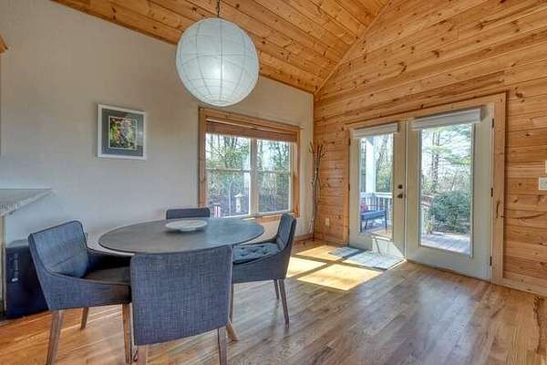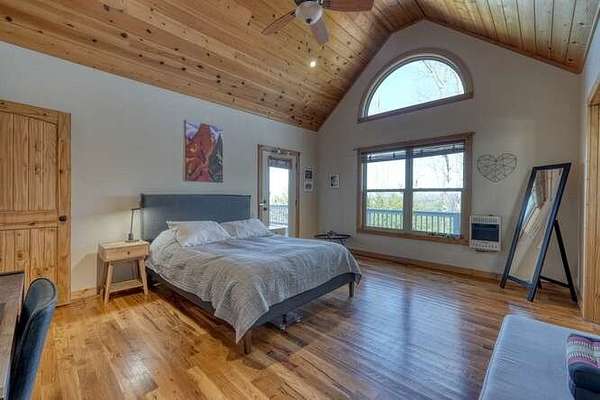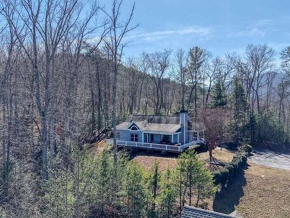 Perched in a premier hilltop setting at the end of a quiet cul-de-sac, this spacious yet cozy 2 bedroom, 2 bath Craftsman-style retreat sits on 5.98 private acres and captures breathtaking long-range views of the Blue Ridge Mountains. Surrounded by pristine forest in a peaceful subdivision, this "Sweet Mountain Home" offers the perfect balance of seclusion and comfort. Inside, an open-concept floor plan seamlessly connects the kitchen, dining, and living areas, all bathed in natural light from oversized windows and a stunning panoramic fixed window that perfectly frames the mountain vistas. Cathedral ceilings, white oak hardwood floors, and a dramatic floor-to-ceiling stone gas fireplace create a warm yet impressive living space. The U-shaped kitchen features wood cabinetry, stainless steel appliances, granite countertops, and a convenient breakfast bar. The primary suite is a true sanctuary with mountain views, a distinctive semi-circular transom window ideal for stargazing, and a spa-like bath complete with a custom-tiled glass shower, jetted garden tub positioned to soak in the scenery, dual vanities, and a generous walk-in closet. A spacious guest bedroom overlooks the forest and is complemented by a full bath. Outdoor living is unmatched with an expansive L-shaped deck wrapping from west to north--your front-row seat to unforgettable North Georgia and Tennessee sunsets. The 5acres borders Bluebird Lane, a National Forest gravel road, providing exceptional privacy and a secondary access point. A trail on the property connects the house to that road. This low-maintenance woodland lot serves as both a valuable privacy buffer and practical emergency egress, enhancing the overall property value. A gravel driveway and tool shed complete this exceptional mountain escape.