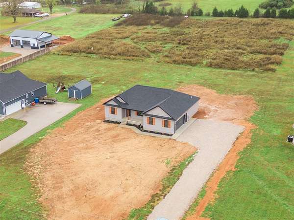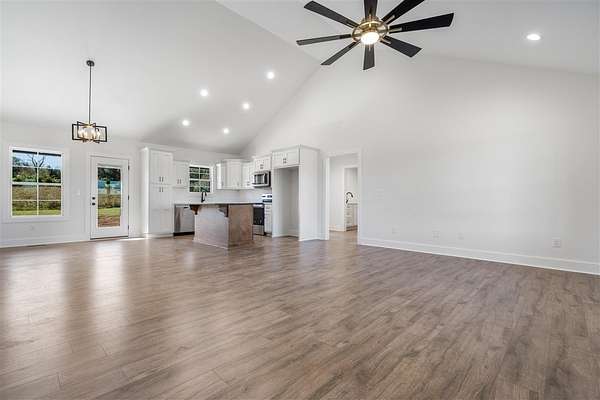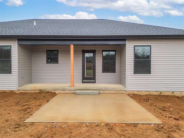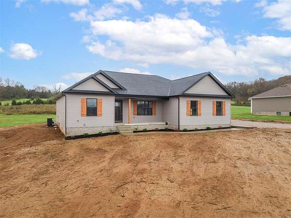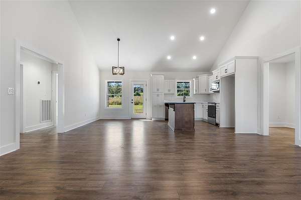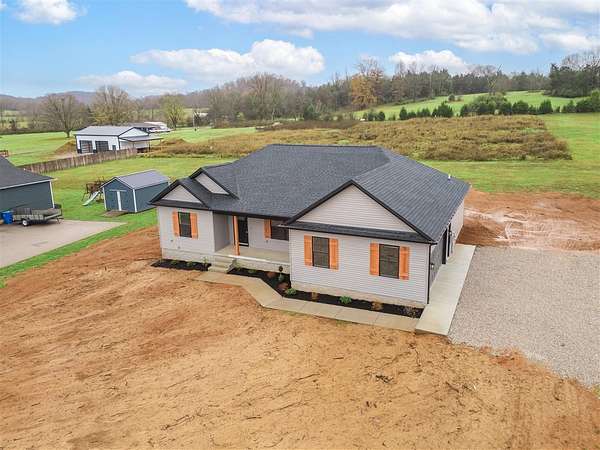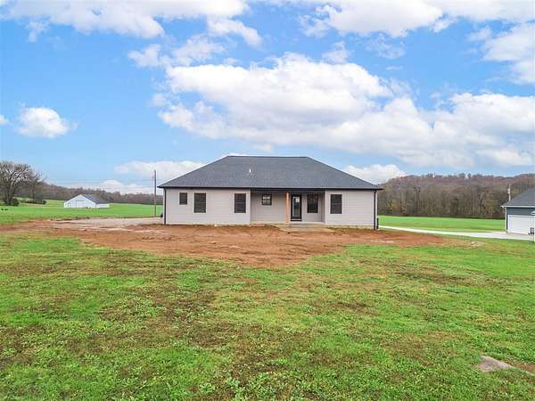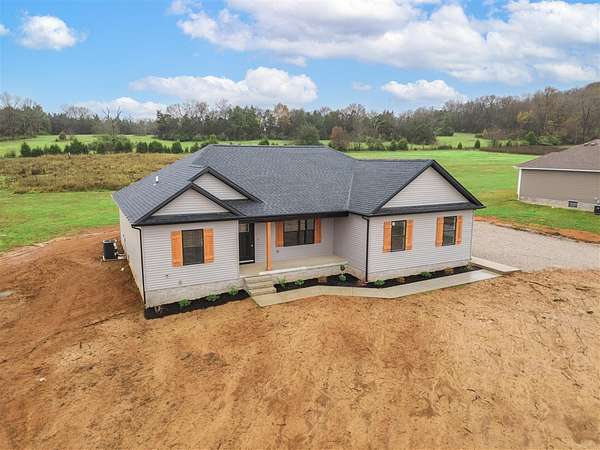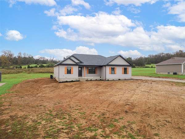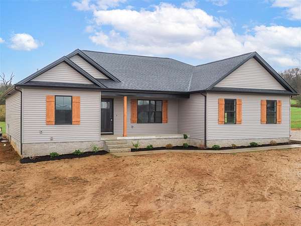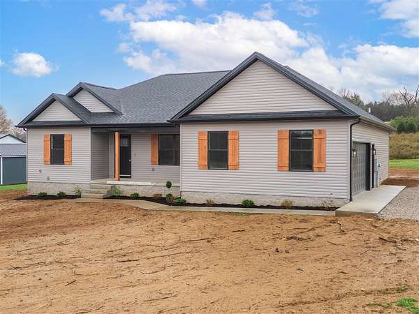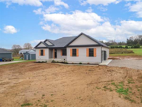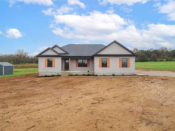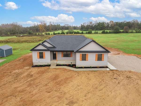 Beautiful New Construction on over 1.5 Acres! Welcome home to this stunning new construction that perfectly combines modern design with country charm. Sitting proudly on over an acre and a half, this home welcomes you with a beautiful exterior, a covered front porch, and thoughtfully designed landscaping that adds to its curb appeal. Step inside and be greeted by an open-concept living area featuring vaulted ceilings, stylish LVP flooring, and modern light fixtures that create a warm, inviting atmosphere. The kitchen is sure to impress with its white cabinetry, stained wood island, quartz countertops, stainless steel appliances, and ample storage. The dining area flows seamlessly into the spacious living room, making it perfect for entertaining or family gatherings. The master suite offers a relaxing retreat with a tray ceiling, a walk-in closet, and a luxurious bathroom complete with a walk-in shower and a gorgeous double vanity with wooden cabinetry and black accents. Two additional bedrooms and a second full bath provide comfort and flexibility for family or guests. The laundry room is thoughtfully designed with a utility sink, cabinet storage, and a convenient hanging area for drying clothes. Outside, you'll love spending time on the back covered porch or patio, where you can enjoy peaceful views of your expansive yard. A two-car attached garage and paved driveway add practicality and convenience. This home truly has it all -- modern finishes, functional spaces, and a serene setting. Don't miss your chance to make it yours!