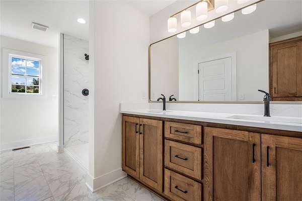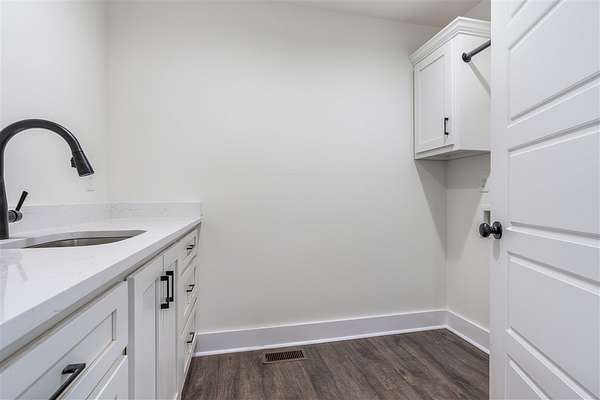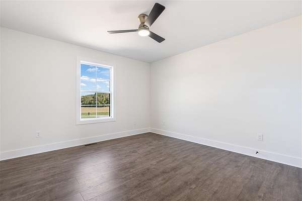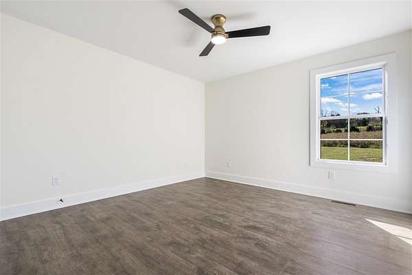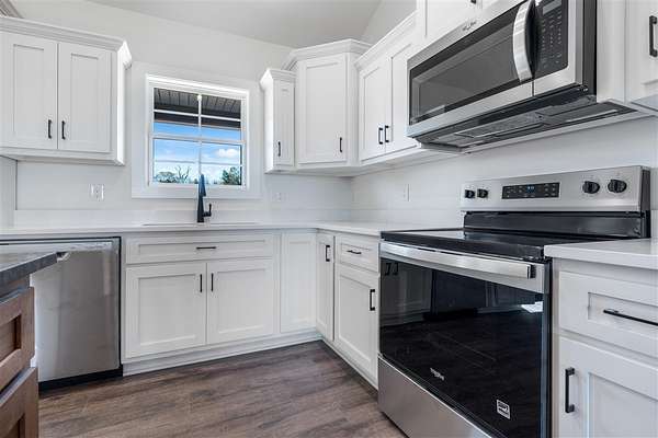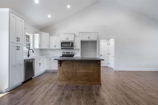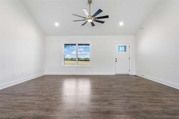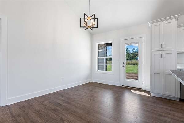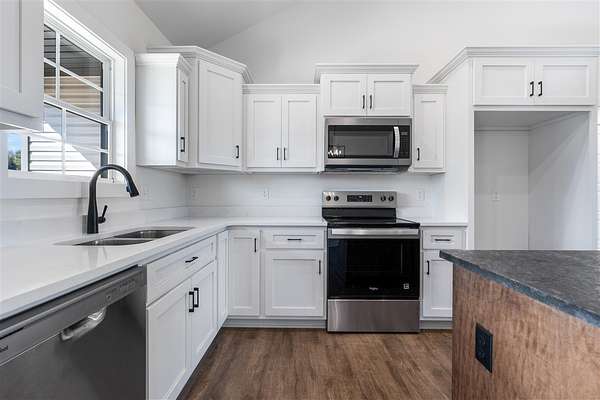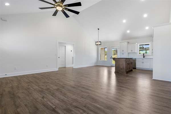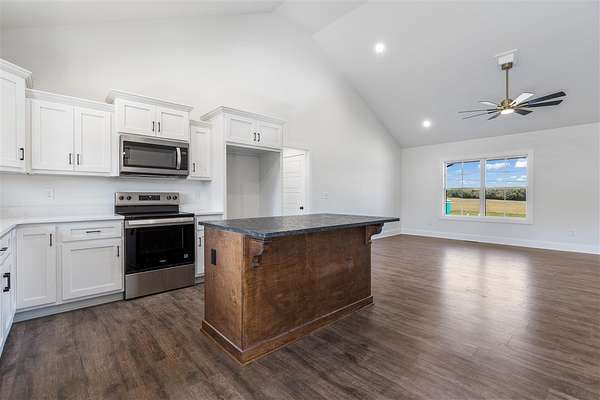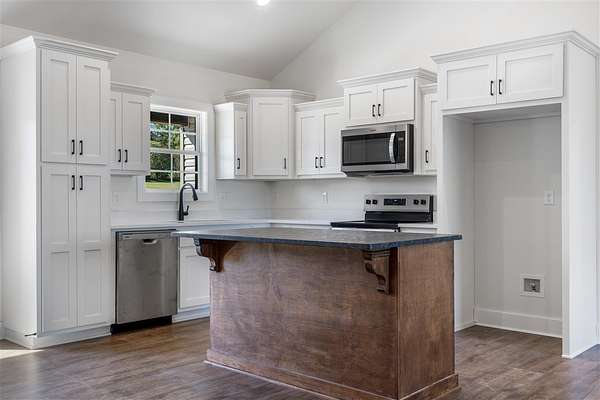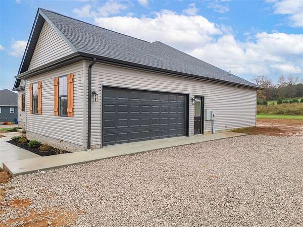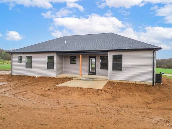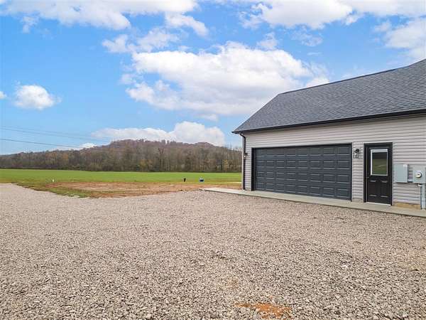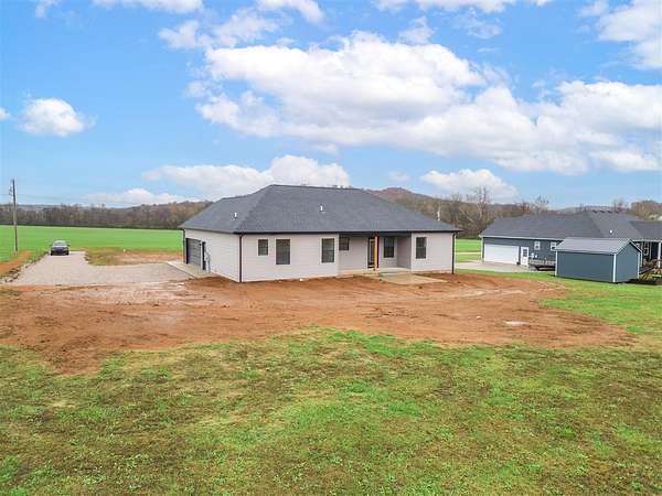 Beautiful New Construction on over 1.5 Acres! Welcome home to this stunning new construction that perfectly combines modern design with country charm. Sitting proudly on over an acre and a half, this home welcomes you with a beautiful exterior, a covered front porch, and thoughtfully designed landscaping that adds to its curb appeal. Step inside and be greeted by an open-concept living area featuring vaulted ceilings, stylish LVP flooring, and modern light fixtures that create a warm, inviting atmosphere. The kitchen is sure to impress with its white cabinetry, stained wood island, quartz countertops, stainless steel appliances, and ample storage. The dining area flows seamlessly into the spacious living room, making it perfect for entertaining or family gatherings. The master suite offers a relaxing retreat with a tray ceiling, a walk-in closet, and a luxurious bathroom complete with a walk-in shower and a gorgeous double vanity with wooden cabinetry and black accents. Two additional bedrooms and a second full bath provide comfort and flexibility for family or guests. The laundry room is thoughtfully designed with a utility sink, cabinet storage, and a convenient hanging area for drying clothes. Outside, you'll love spending time on the back covered porch or patio, where you can enjoy peaceful views of your expansive yard. A two-car attached garage and paved driveway add practicality and convenience. This home truly has it all -- modern finishes, functional spaces, and a serene setting. Don't miss your chance to make it yours!