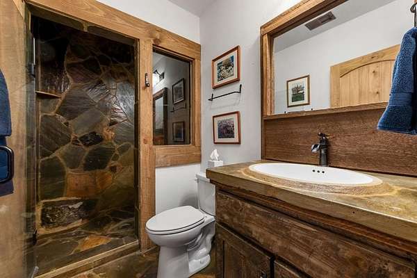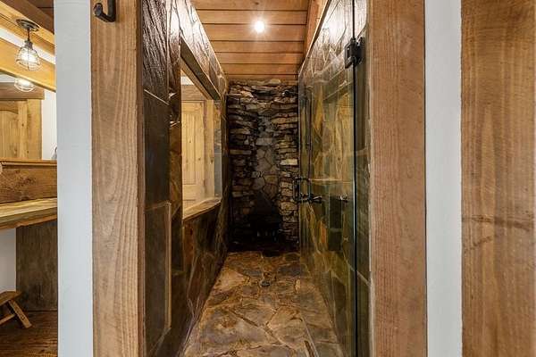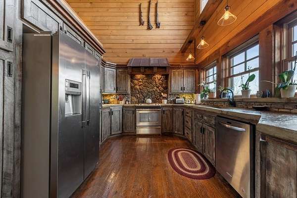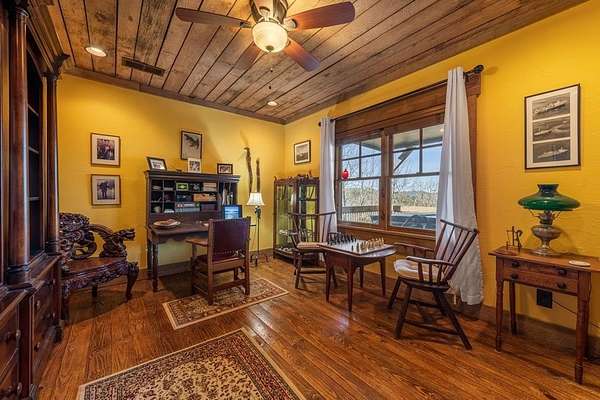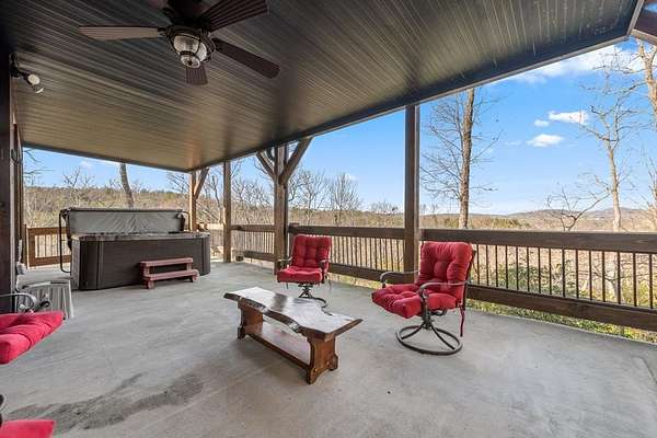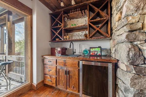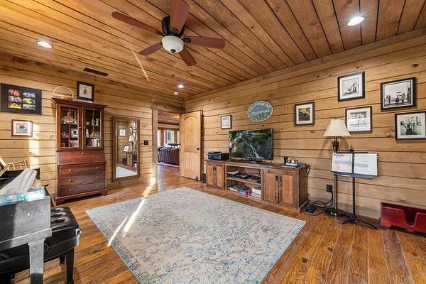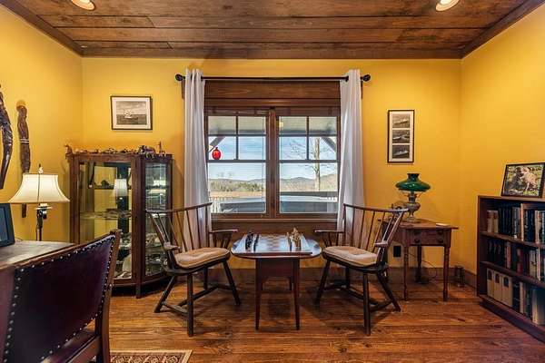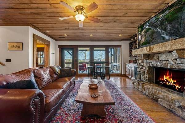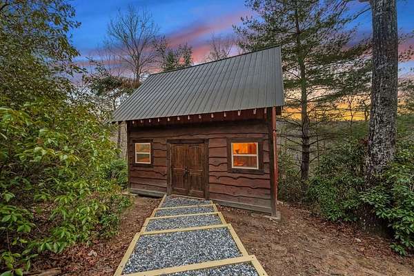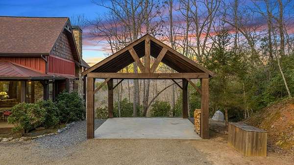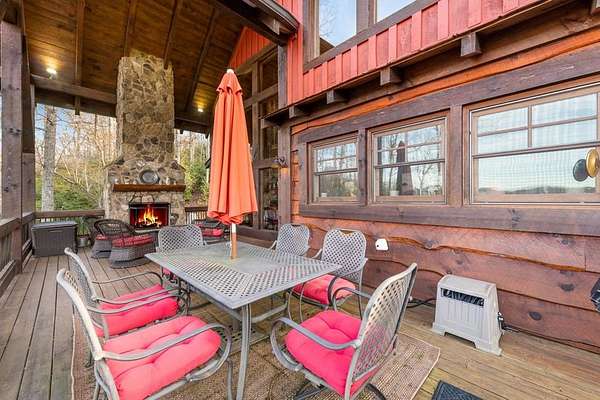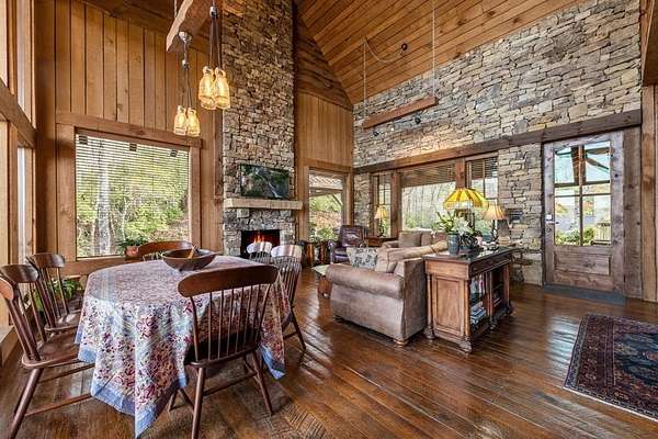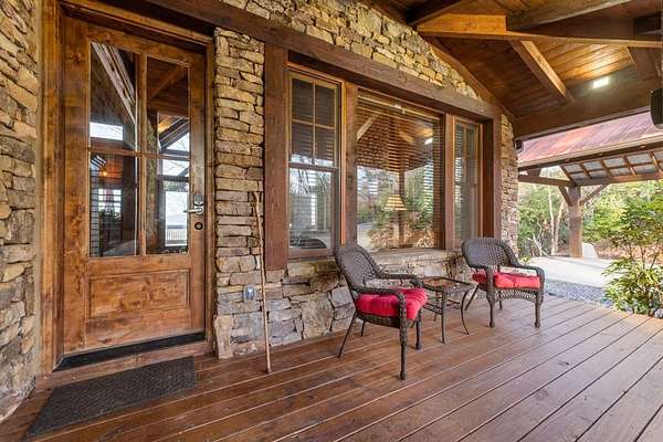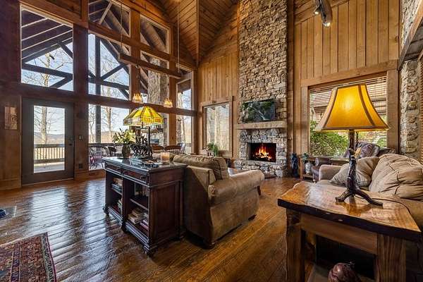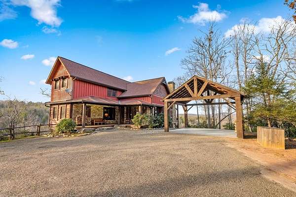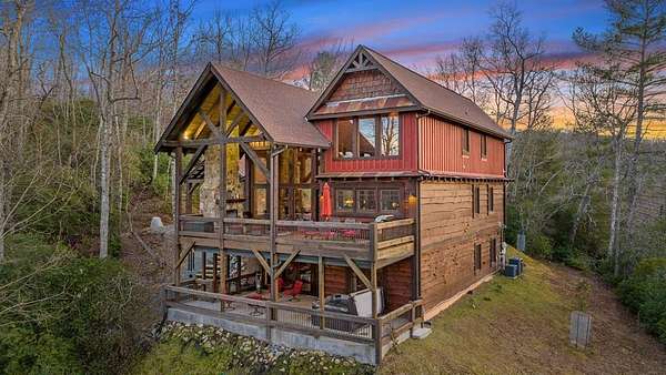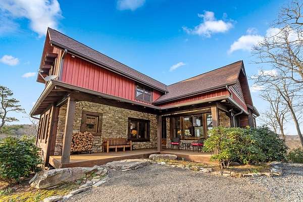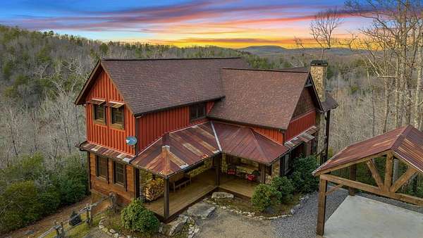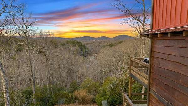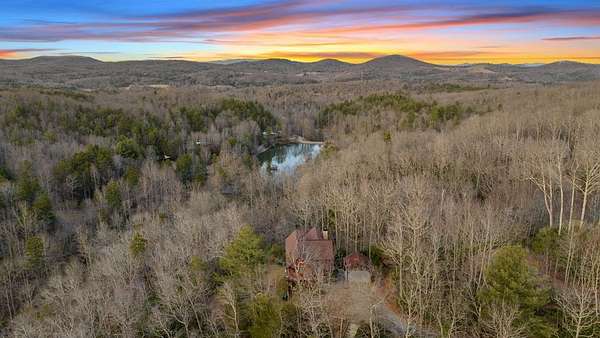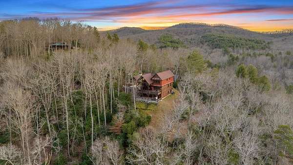 Exquisite Keith Sumner luxury cabin in the North Georgia Mountains! This 4-bedroom, 3.5 bath home offers 3,055 square feet of living space over 3 floors. Two interior stacked stone gas fireplaces command attention. One is towering 30 feet high in the main living area and the other is located in the lower living area. A south-facing front porch is surrounded by rhododendrons and views of Ditney Knob. The back porch becomes a gathering place at the dining area or in front of the massive outdoor log-burning fireplace. Here, one can enjoy the vista to the north spanning across seven Georgia mountains. Beyond them, far off, is Dickey Top Mountain in North Carolina. In addition to the mountain views, there is a water view down below of the lake to which this property has deeded rights to. Cook Stream feeds the lake that is 30 feet deep, offering bass fishing and recreational kayaking. All of this can also be viewed from the treetop bedroom on the third floor. There is a third porch off of the lower living area where similar views can be seen while enjoying the hot tub. This home is situated at the end of a cul-de-sac offering complete privacy within a gated community. The 3.75 acres includes a 2nd lot where an adorable storage building resides which would make a wonderful tiny guest house. Truly a stunning mountain home awaiting You!