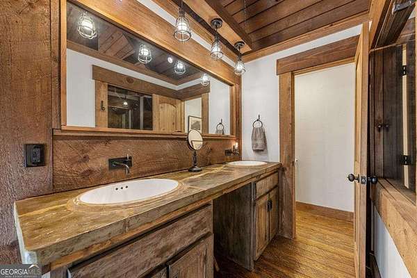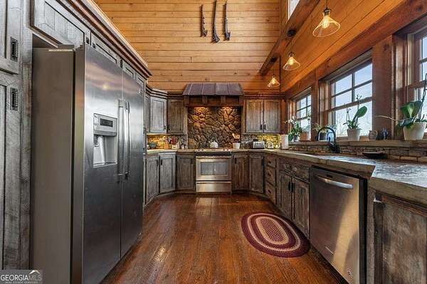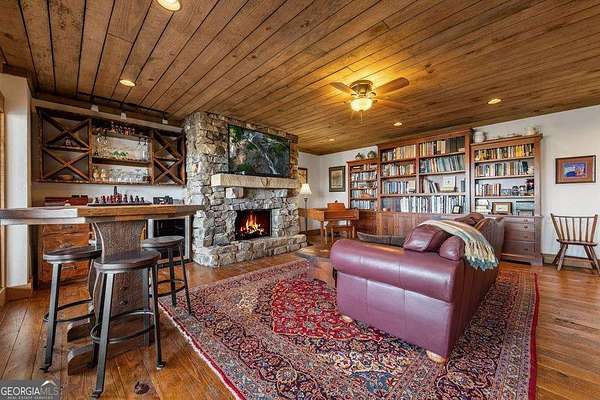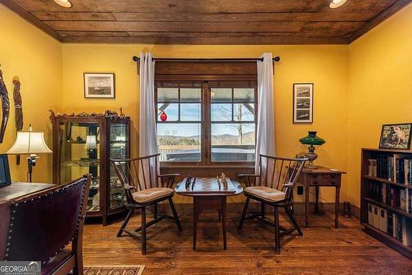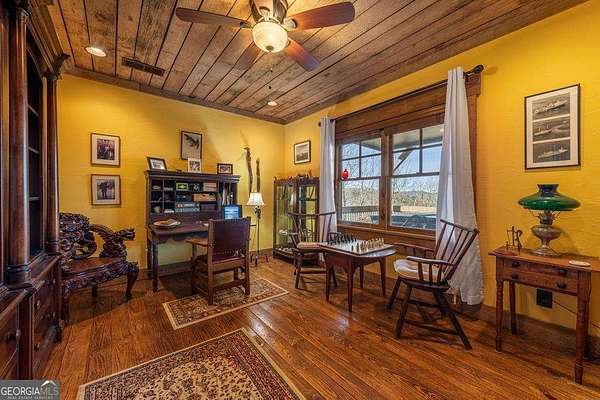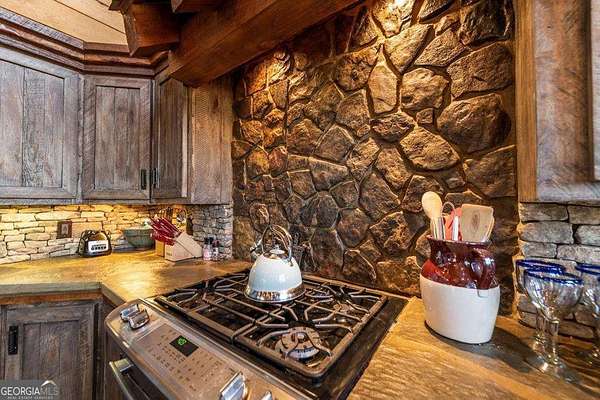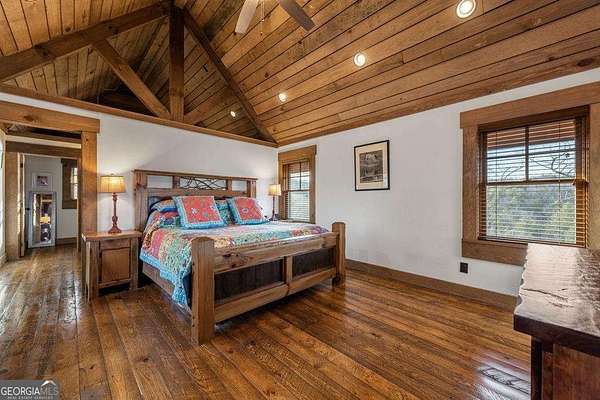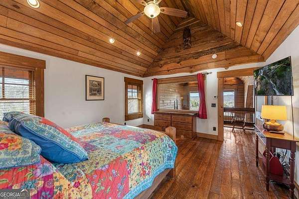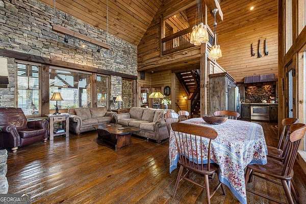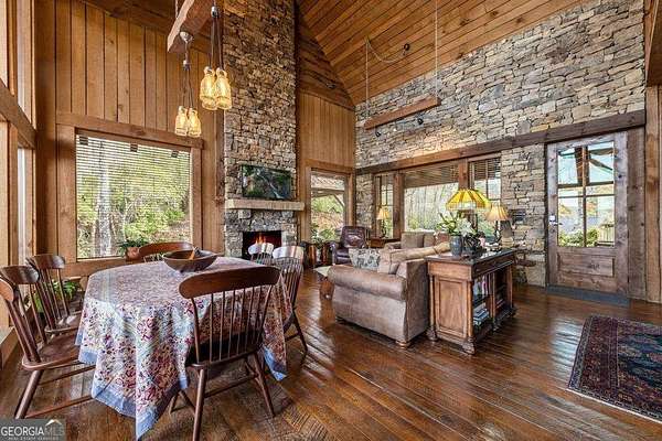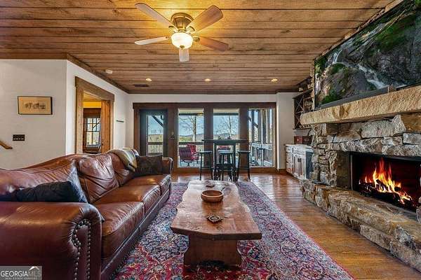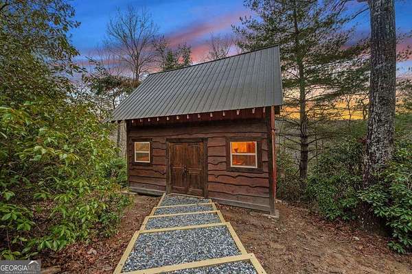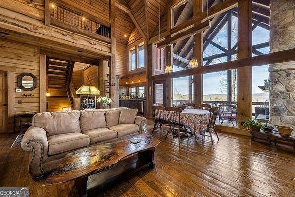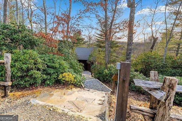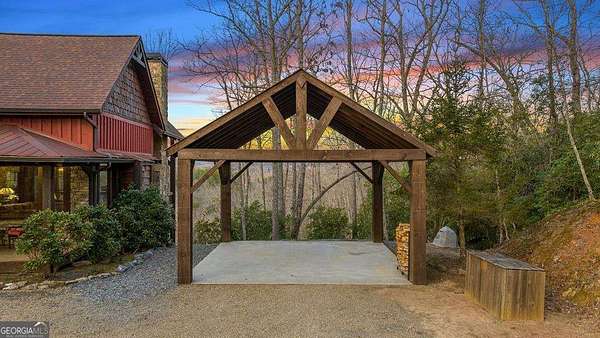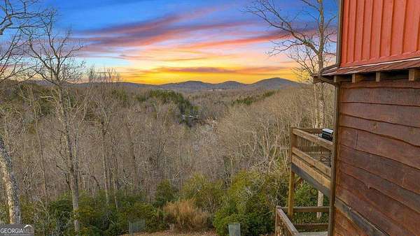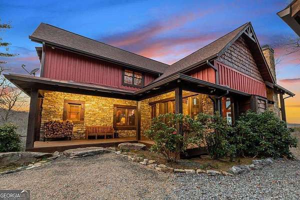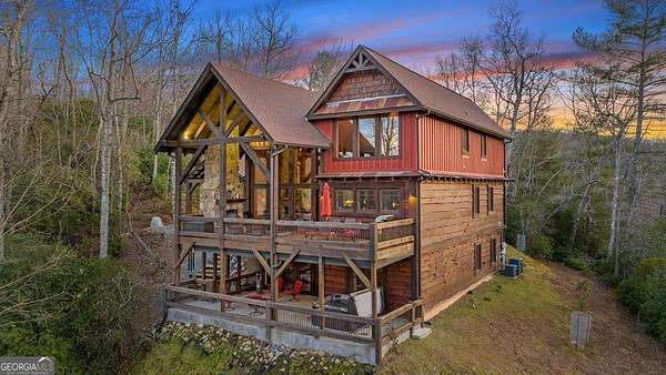 Exquisite Keith Sumner luxury cabin in the North Georgia Mountains! This 4-bedroom, 3.5 bath home offers 3,055 square feet of living space over 3 floors. Two interior stacked stone gas fireplaces command attention. One is towering 30 feet high in the main living area and the other is located in the lower living area. A south-facing front porch is surrounded by rhododendrons and views of Ditney Knob. The back porch becomes a gathering place at the dining area or in front of the massive outdoor log-burning fireplace. Here, one can enjoy the vista to the north spanning across seven Georgia mountains. Beyond them, far off, is Dickey Top Mountain in North Carolina. In addition to the mountain views, there is a water view down below of the lake to which this property has deeded rights to. Cook Stream feeds the lake that is 30 feet deep, offering bass fishing and recreational kayaking. All of this can also be viewed from the treetop bedroom on the third floor. There is a third porch off of the lower living area where similar views can be seen while enjoying the hot tub. This home is situated at the end of a cul-de-sac offering complete privacy within a gated community. The 3.75 acres includes a 2nd lot where an adorable storage building resides which would make a wonderful tiny guest house. Truly a stunning mountain home awaiting You!
