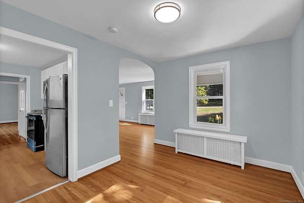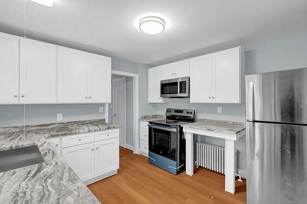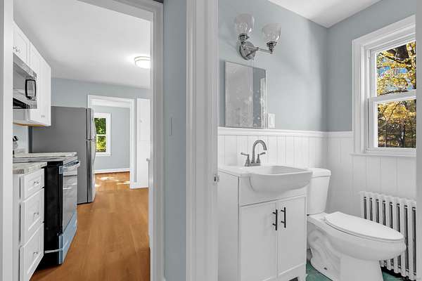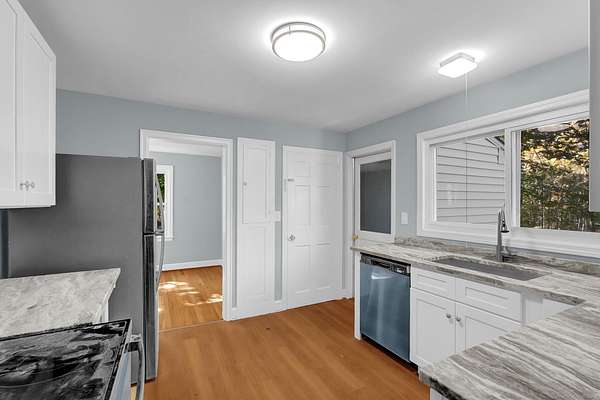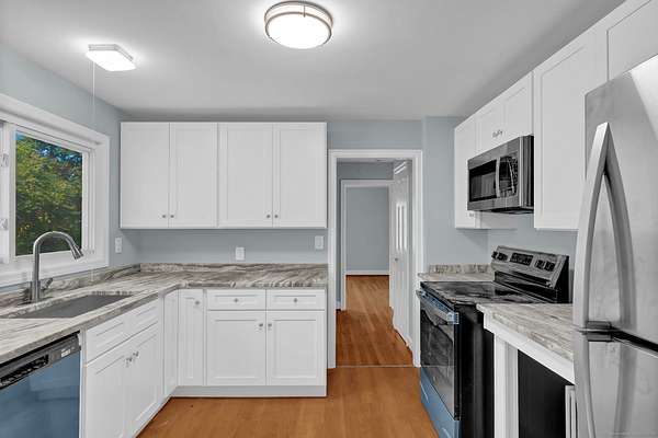 Welcome home to this newly renovated two bedroom ranch with modern touches and cozy charm. Step inside to bright and inviting living room and dining room area with hardwood floors, making this open concept perfect for entertaining. Hardwood floors continue into each of the two bedrooms, creating a seamless flow and cozy living space. As you enter into the kitchen you will see brand new granite counter tops, cabinets, and stainless steal appliances. Off the kitchen, you will find a mudroom that is perfect for access to the backyard. Whether you are looking for your first home, looking to down size, or enjoy the convenience one floor living, this home is move in ready and a must see.