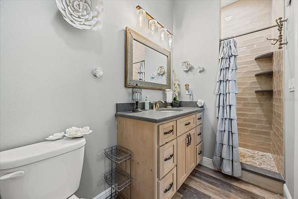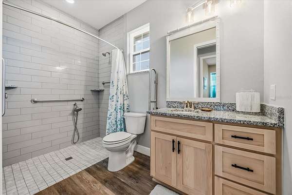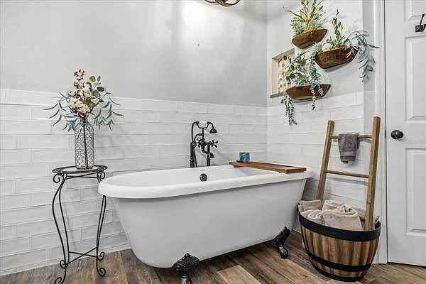 The primary suite provides a luxurious escape with dual vanities, granite counters, a claw-foot tub, and a spacious two-person subway-tiled shower with pebble flooring and rain shower head. Each bathroom mirrors the same designer details, while wide-plank laminate flooring throughout adds warmth and timeless appeal.