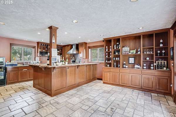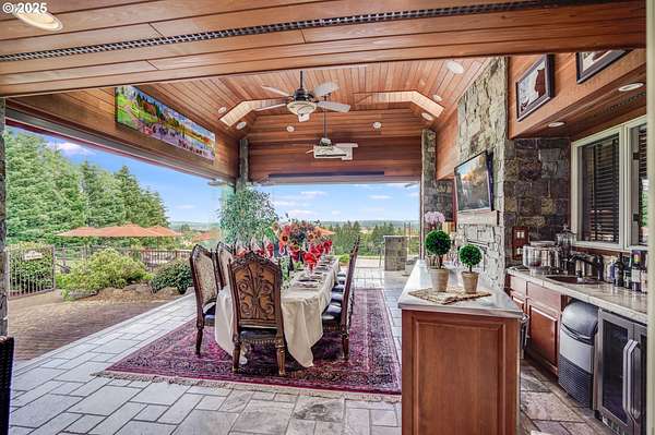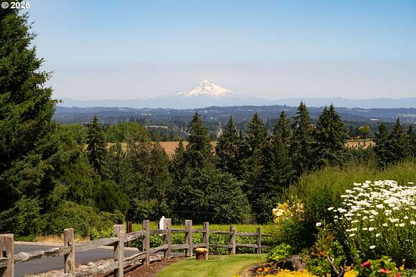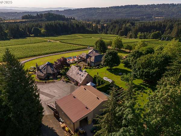 Experience luxury living in the heart of Oregon wine country. Nestled on 20 serene acres in the Laurelwood AVA, this gated estate features a stunning 15-acre mature vineyard with panoramic views, including breathtaking vistas of Mt. Hood and the surrounding countryside.The 3,024 sq/ft custom home exudes elegance with a gourmet kitchen, opulent primary suite, and a one-of-a-kind walk-in closet with custom built-ins. An attached glass-enclosed pavilion offers year-round entertaining with seamless flow to an expansive patio, infinity pool, and sweeping 4-mountain vineyard views.The separate piazza-style tasting room creates a perfect hospitality space with its stone paver flooring, lodge-style fireplace, and open-air design. A versatile 1,500 sq/ft studio with loft, office, and 1/2 bath, along with a 40'x28' barn and walk-in cooler, offer flexible options for wine production, events, or personal retreat.Whether you're looking to craft world-class wines or simply enjoy the beauty and tranquility of vineyard living, this exceptional property offers it all. Welcome to your private wine country sanctuary-timeless, picturesque, and uniquely yours.