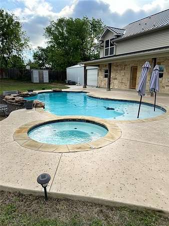 Step outside to your own private oasis with an inground pool featuring a diving rock, hot tub, and outdoor fire pit, creating the ideal setting for year-round relaxation or entertaining. The outdoor space is thoughtfully designed for relaxation and entertainment, plumbed for both an outdoor shower and a future outdoor kitchen. Easily connect your phone to enjoy your favorite music while spending time by the pool and in the outdoor living area--perfect for hosting gatherings or unwinding in your private retreat.