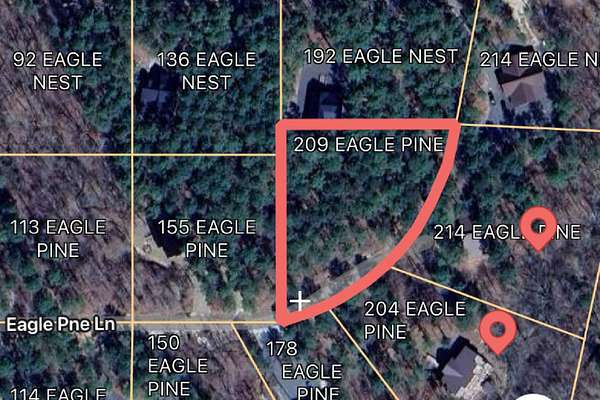 Escape to the pinnacle of privacy at 209 Eagle Pine Lane, Lot 17, nestled in the prestigious Eagle Mountain Phase 4. This exceptional 1.3-acre lot boasts a heavily wooded landscape dominated by towering, ancient pines, creating a majestic natural retreat. Perfectly positioned at the end of a serene private road, its relatively level terrain offers an ideal canvas for effortless construction of your dream estate or a lucrative STR. Teeming with lush greenery and the quiet charm of its secluded setting, this rare gem awaits the discerning buyer seeking an exclusive sanctuary.