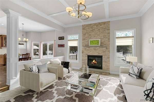 The Key To Your Dream Home is here at this meticulously maintained Custom Built Forbes Capretto home. This exceptional residence offers 3 beds with a 1'st floor primary, 2.5 baths & 2,607 square feet of refined living space set on a breathtaking 4.6 acre wooded lot. Exterior highlights;upgraded stone front facade, cedar shake siding, x-wide concrete driveway, covered porch entryway, professional landscaping surround &exterior lighting.This home combines luxury craftsmanship, thoughtful upgrades, and resort-style outdoor living.1'st floor showcases 9' ceilings throughout, soaring to 10' in the dining rm and 10.5' in the living rm, accented by a stunning coffered ceiling and a gas fireplace w/ raised stone facade, hearth, &mantle.Hand-scraped hickory hardwood floors flow seamlessly throughout the main living areas.Chef's dream kitchen w/granite countertops, a travertine tile backsplash, under-cabinet lighting, additional in-wall oven, walk-in pantry, convenient dry bar and eat in dining rm area w/built ins that lead to your covered patio is the perfect floorplan for all your entertaining needs. Office/Den has Custom built-ins w/bookshelves & window seat. Garage entry has shiplap mudroom with cubbies that add charm and organization. A spacious 1'st floor laundry rm offers shelving&counter space.Grand 1'st flr Primary Suite provides a private retreat w/sliding door access to the outdoors , Spa Bath w/soaking tub & tile shower, dual vanity & glamorous walk-in California closet.2 spacious Bedrooms share hallway full bath and office/reading loft shared complete 2'nd floor.Outdoor living is truly unmatched featuring multi-level Trex deck, covered back patio w/ fan and epoxy flooring, custom fire pit.Saltwater pool features full-width walk-in stairs and a salt chlorination/filtration system. A tranquil drainage creek and pond enhance the natural setting.Upgraded tankless hot water system, sump pump water backup system, alarm system, and irrigation system. A rare opportunity to own a meticulously upgraded, move-in-ready home offering luxury, privacy, and resort-style living. Some rooms virtually staged for design & layout. OPEN HOUSE SUNDAY 2/15 @ 12-3PM