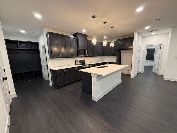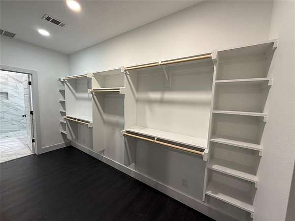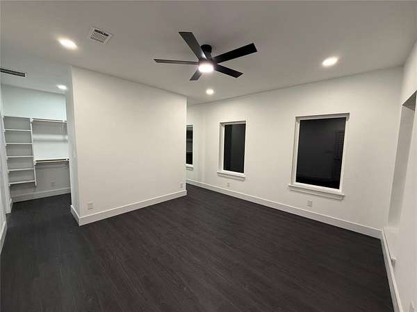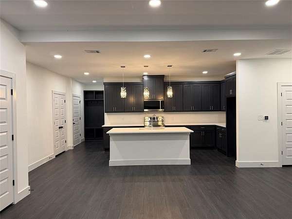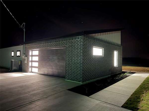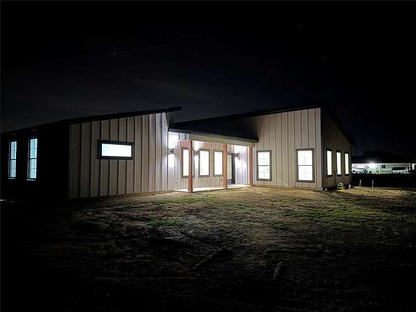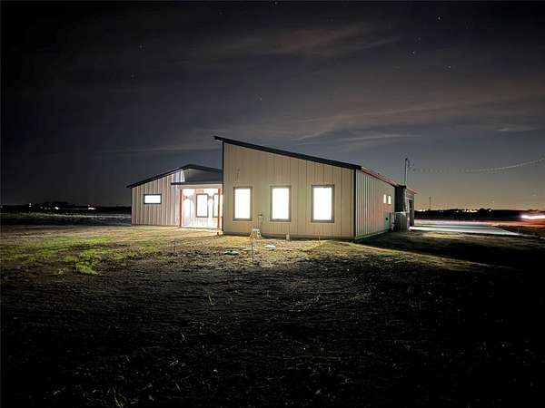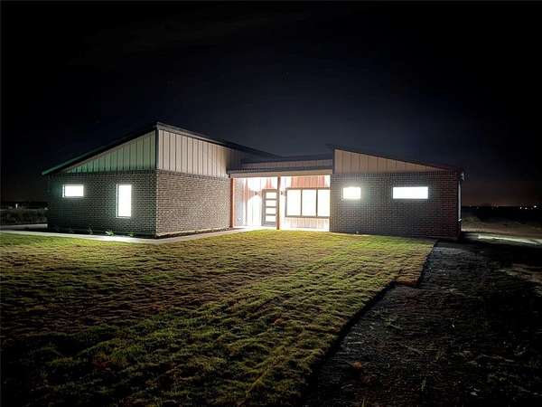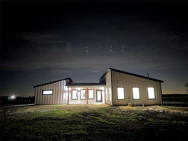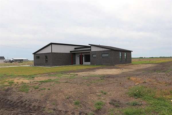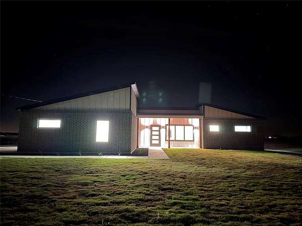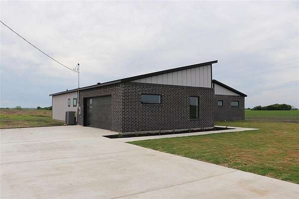 Modern home on 2.44 acres just outside Avalon in Ellis County. Open-concept living with custom cabinetry and abundant natural light. Primary suite features walk-in closet with built-in vanity, quartz counters, shelving, and wood hanging rods. Exterior combines dark charcoal brick, white paneling, black-framed windows, sloped roofs, and a standing-seam metal accent. Spacious garage and plenty of land for outdoor living. Modern design, thoughtful details, and rural charm in one exceptional home.