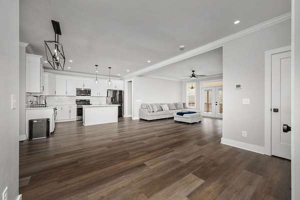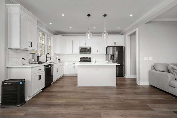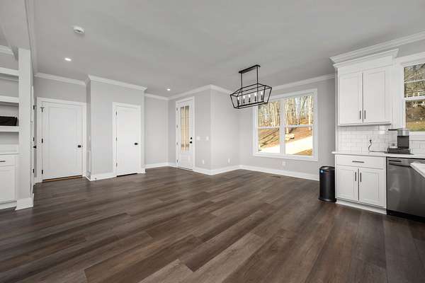 The open‑concept layout features functional living spaces ideal for both everyday living and entertaining, including a walk‑in pantry and seamless access to covered front and rear porches overlooking a serene, wooded landscape. A walk‑out basement offers abundant storage and flexible space suitable for hobbies, a workshop, or future expansion.