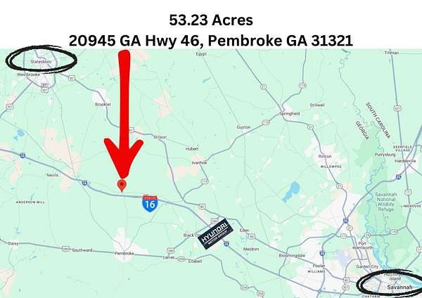 Beautiful 53.23 acres of near-level land well located just off Interstate 16 at the Ash Branch Church Road exit. The property sits on the north side of Interstate 16 at the intersection of Highway 46 and Arcola Road and has open farm land as well as some timber. This section of I-16 sees approximately 37,000 vehicles per day. Located just ten miles from the new automobile plant this parcel could be used for a variety of different things. It is currently zoned agricultural (AG-5 per Bulloch County). On the lower western corner of the parcel is approximately 4 acres with a house that is not included with this parcel. This parcel is conveniently located approximately halfway between Statesboro and Savannah. The owner is a licensed real estate broker in the state of Georgia. 48.42 acres located directly across the street are also available for sale. Beautiful 53.23 acres of near-level land well located just off Interstate 16 at the Ash Branch Church Road exit. The property sits on the north side of Interstate 16 at the intersection of Highway 46 and Arcola Road. 1/4 Mile from Interstate-16 10 Miles from Hyundai Motor Group Metaplant 37,000 VDP on I-16