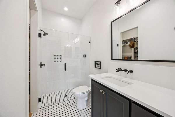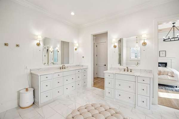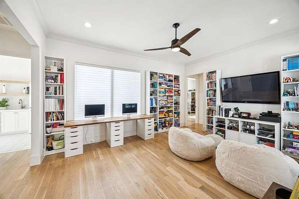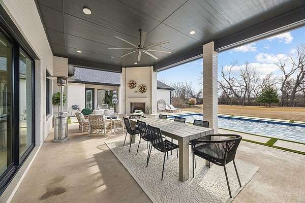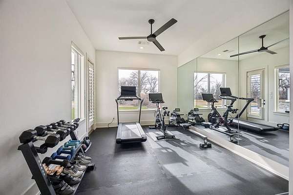 Built in 2022 by award-winning, family-owned Dave R. Williams Homes, this exceptional 4,687 square foot, north facing single story estate sits on a premium 1.5 acre lot in gated Hidden Creeks Pointe and backs to a tranquil greenbelt and creek setting. Grand double iron doors open to a light filled, open concept design with wood beamed ceilings, nailed down hardwoods, plantation shutters, designer lighting, and custom built ins. The chef's kitchen is equipped with Sub Zero and Wolf appliances, double ovens, Bosch dishwasher, pot filler, an oversized island with built in Scotsman ice maker, and a spacious butler's pantry. A thoughtfully split plan offers 4 bedrooms, 4 full baths and a half bath off the game room with direct access to the pool deck. Additional highlights include a home office with closet, ethernet, TV outlet and floor plug, game room, fully-loaded media room with wet bar, private gym with direct pool access, and a Texas basement for storage and HVAC access. The primary retreat features an electric fireplace, coffee bar, spa bath with separate vanities, dual walk-in closets, and additional laundry hookups in main closet. Smart-home and peace-of-mind upgrades include whole home ethernet plus multiple wireless access points, 6 to 8 exterior cameras, motorized shades, Orkin pest and mosquito proofing, and a reinforced storm shelter. A whole-home Generac generator, water treatment and softener system, and under sink reverse osmosis filtration ALL convey. Outdoor living shines with a covered patio, heated pool and spa, kitchen with grill, griddle, refrigerator, and sink, fireplace with TV outlet and speakers, turf play areas, fenced dog run, and an oversized 4 car garage with epoxy floors and built in storage. Located in Celina's ETJ, which is outside Celina's city limits, the estimated 2025 effective tax rate is roughly 1.44% per public records, meaning materially lower annual carrying costs, and with no MUD or PID for additional long-term savings!