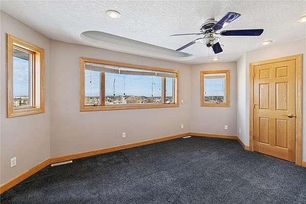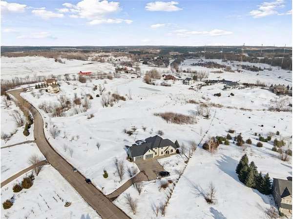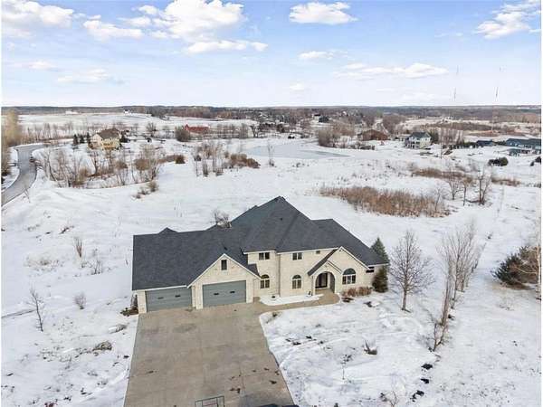 Situated on a 9.53 acre lot in Prior Lake! This contractor-built custom residence is defined by scale, craftsmanship, and breathtaking panoramic views from nearly every window. Thoughtfully designed to balance grandeur with livability, the home offers expansive, light-filled interiors and a seamless connection between levels. The upper floor features three beautifully appointed bedrooms and baths, anchored by an oversized bonus room that invites both relaxation and entertaining. The main level is highlighted by a private primary suite and dedicated office, creating a refined yet functional everyday retreat.