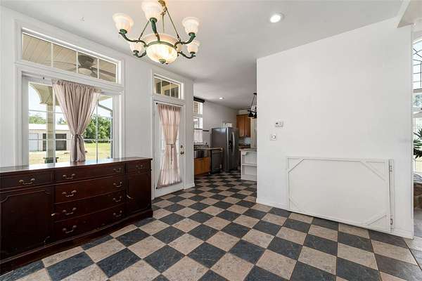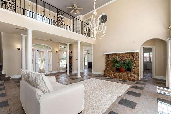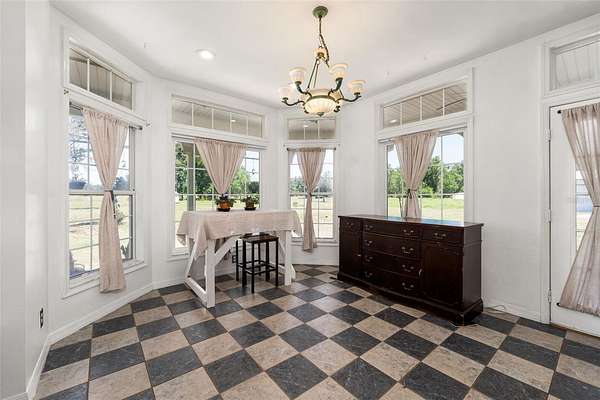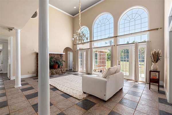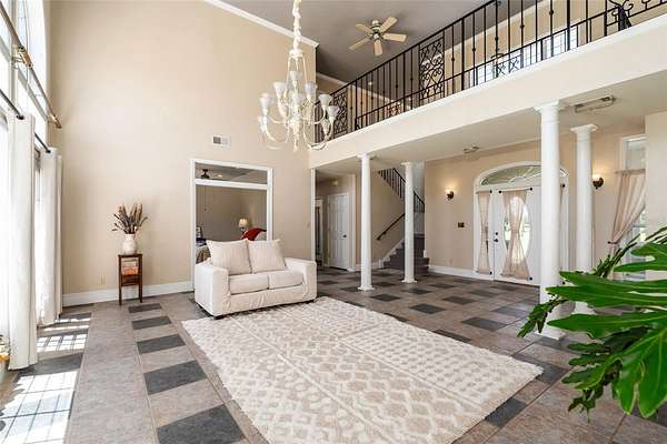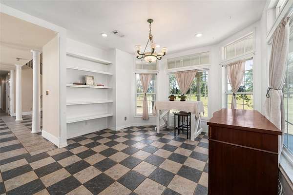 Throughout the home, there are tons of arched and picture windows, along with crown molding, chandeliers, ceiling fans, and a double-sided gas fireplace that connects the living room and kitchen. The kitchen has granite countertops, stainless steel appliances, a deep farmhouse sink, glass-front upper cabinets, a coffee bar, and a pantry. The dining area sits just off the kitchen and includes built-in shelving. Behind a pocket door, there’s a utility room with the washer and dryer, extra storage, and access to a bathroom.