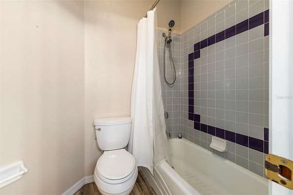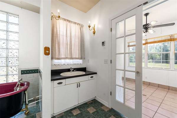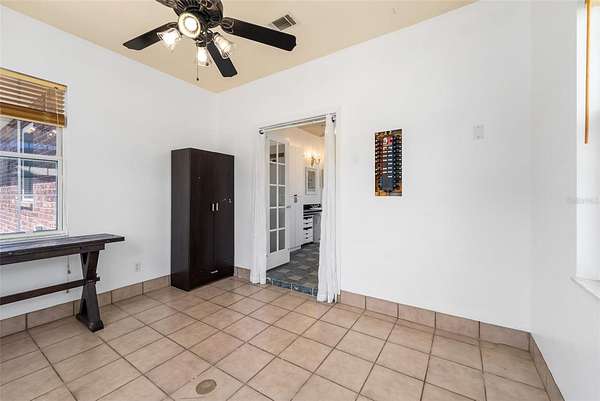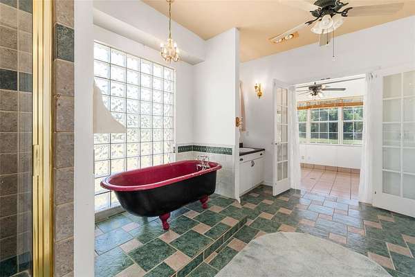 The primary suite is downstairs, and it has two walk-in closets and a spacious bathroom with separate vanities, a walk-in shower with built-in shelving, and a clawfoot tub under a chandelier. There’s also a glass block wall that brings in natural light without giving up privacy. Right off the bathroom is a flex room that’has endless possibilities like a a craft space, additional closet or nursery, but it did used to have an indoor hot tub and still has a Rinnai temperature control hooked up to an exterior tankless water heater (buyer should verify future use).