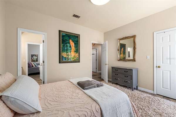 The first bedroom off the hallway has its own bathroom that can also be accessed from the hall, which works well for guests. Two more bedrooms both have walk-in closets and share a Jack-and-Jill bathroom with double sinks, while the shower and toilet are separated. The fourth bedroom has a built-in window bench with storage and another large walk-in closet.