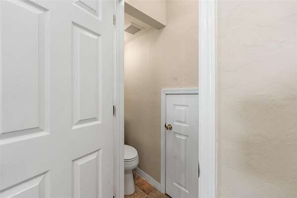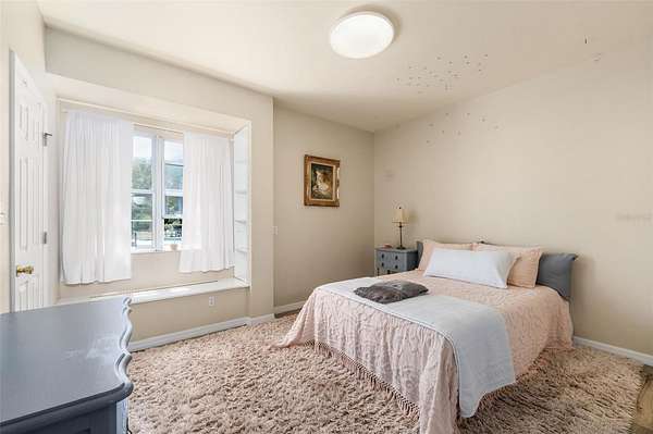 Upstairs, there’s an open catwalk with black iron rod railing that overlooks the main living space on the first floor. It leads past a small library nook with built-in book shelf to the fifth bedroom, which is oversized with vaulted ceilings, arched windows, a private toilet area, and extra attic access.