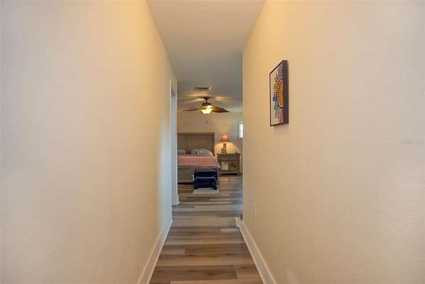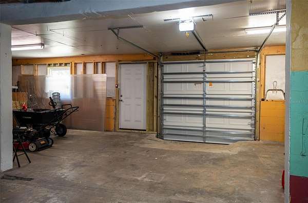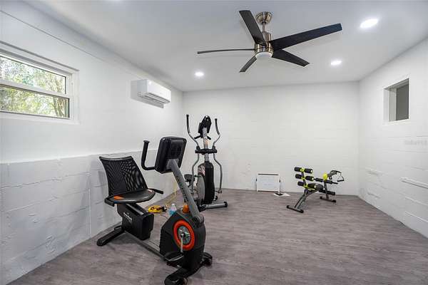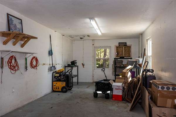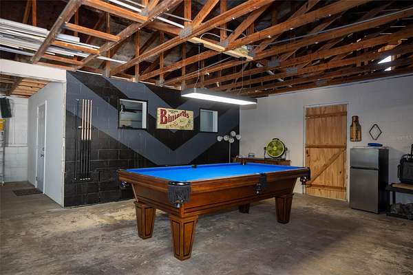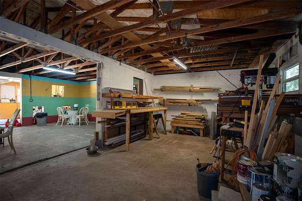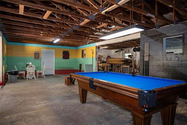 A standout feature is the massive newly painted block barn featuring a cement ramp, leading to the garage door and patio area . This building has separate electric, new roof, new hurricane windows, new electric garage door and two new RV electrical outlets. This well lit barn/outbuilding is so large it currently houses tractor and lawn equipment, an air conditioned gym, woodworking area, storage and hobby area, complete with an entertainment section currently housing a pool table and darts.