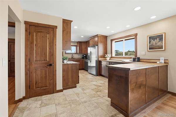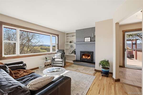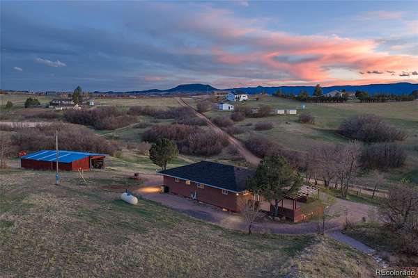 Castle Rock dreams come true on this unique 5 acre property, offering peaceful country living with convenient access to modern amenities. Located just outside the hustle and bustle with easy access to Wolfensberger Road and nearby highways, you will enjoy both privacy and accessibility. This charming home features 4 bedrooms plus an office, filled with character and thoughtful updates throughout. The remodeled kitchen showcases dark custom cabinetry, stainless steel appliances, and granite countertops, perfect for everyday living and entertaining. The main floor offers hardwood flooring, a cozy fireplace, abundant natural light, and stunning mountain views. Enjoy two patio and deck spaces ideal for relaxing or hosting guests. The main level includes two bedrooms, a bathroom, and a non conforming office. The finished basement adds new carpet, two bedrooms, a bathroom, and a spacious family room with a second fireplace. Outside, you will find a detached, ventilated 3 car garage and a 400 sq ft heated and air conditioned ADU, ideal for guests, a studio, or rental potential. The barn or loafing shed is ready for animals, with plenty of space to roam and enjoy the wide open landscape. With breathtaking views and versatile living, this rare Castle Rock property is one you will not want to miss.