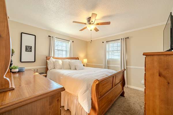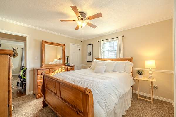 Inside, the living room features beautiful exposed wood beams and a wood fireplace creating a warm and inviting gathering space. The solid brick construction provides durability and low-maintenance living. Master suite with his and her closet and half bath with shower. Large eat in kitchen with stainless steel appliances included and two additional spacious bedrooms.