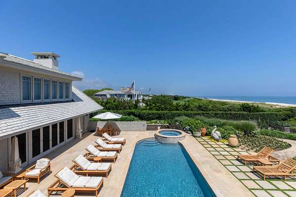 With approximately 200 feet of direct ocean frontage on one of Sagaponack's most private and prestigious lanes shared by only three other homes, this is a generational opportunity rarely seen on the East End. Two separate parcels (both with deeded beach access), protected by a non-conforming pre-existing rock revetment, offer extraordinary potential in a setting that is as private as it is breathtaking. The main residence is a commanding, nearly 9,000 sq. ft., modern beach house-built with substance and intention. Floor to ceiling walls of glass open the home to the serene ocean landscape, offering uninterrupted views of the Atlantic Ocean and dramatic sunsets over a neighboring pond. Terraces spill out toward a pool, spa, and wildflower meadow that runs all the way to the dunes, where a pre-existing (and grandfathered) pavilion and private stairs deliver you directly to one of the widest stretches of beach in the Hamptons. A pre-existing, non-conforming lower level is fully built out with staff quarters, wine cellar, gym, game room and more. The home's scale, quality construction, and excellent condition make it an ideal canvas for reimagination-whether reconfiguring the interior or elevating the existing design to match its surroundings. Directly across the private gravel drive, the second parcel offers a blank slate with deeded ocean access and its own executive golf course. It's perfectly suited for a guest house, expanded estate grounds, or added amenities like tennis and pickleball. This is not just a property - it's a true compound - in one of the most coveted oceanfront enclaves in the world.