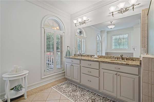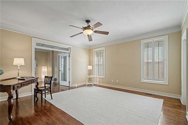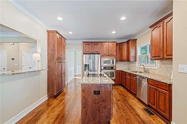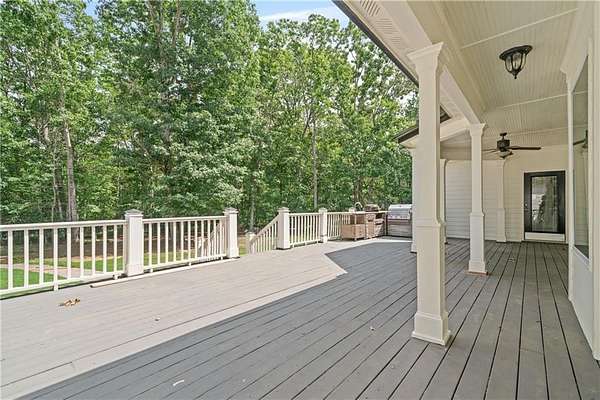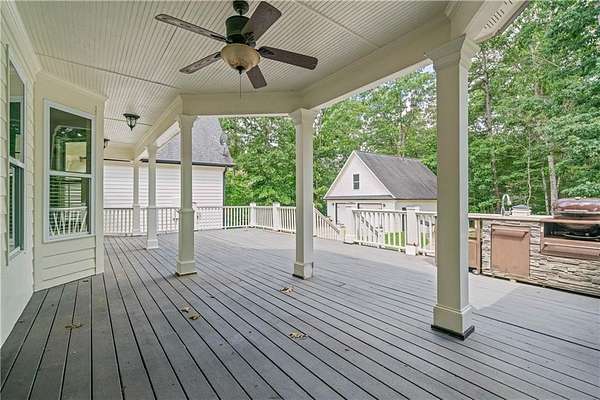 Inside, hardwood floors, crown molding, and plantation shutters create a timeless feel. The kitchen is equipped with granite countertops, a center island with cooktop, stainless steel appliances, and plenty of cabinetry for storage. It opens to a spacious living area with a fireplace and built-in shelving, as well as access to the covered back deck--complete with ceiling fans and an outdoor kitchen area.
