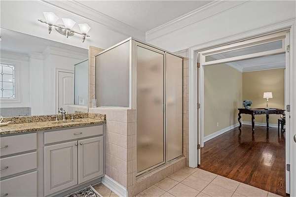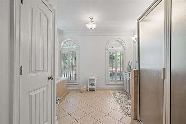 The main-level primary suite features a walk-in closet and a spacious bath with dual vanities, a soaking tub framed by a decorative privacy window, and a separate tiled shower. Two additional bedrooms and a full bathroom are located upstairs along with the versatile bonus room.