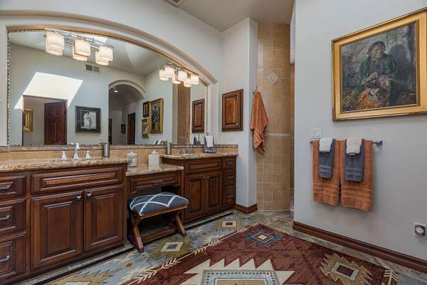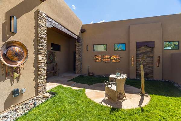 Estate caliber single level living in the gated Paa Ko community, introduced by an inviting courtyard entry and set on a premium double lot with commanding mountain views. Light filled open design with multiple fireplaces, 3 private bedroom suites, dedicated office, and a serene view primary suite with patio access. Chef's kitchen with high end appliances and generous storage. Detached studio casita (2019) with its own garage offers ideal guest or creative space. Resort style outdoor living with expansive covered patios, built in grill and outdoor fireplace. Solar plus major system upgrades including TPO roof 2023 and new HVAC 2023. Impeccable landscaping, asphalt drives, and 4 car garage with oversized bays and temperature controlled storage. About 20 minutes to ABQ and 45 to Santa Fe.