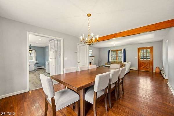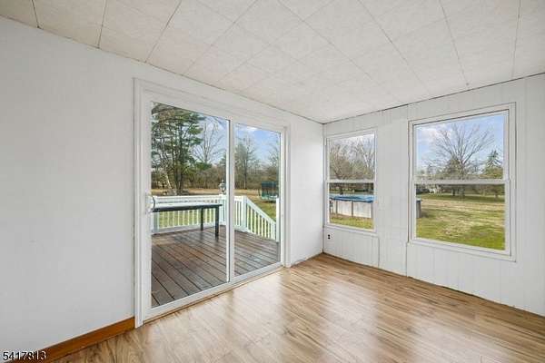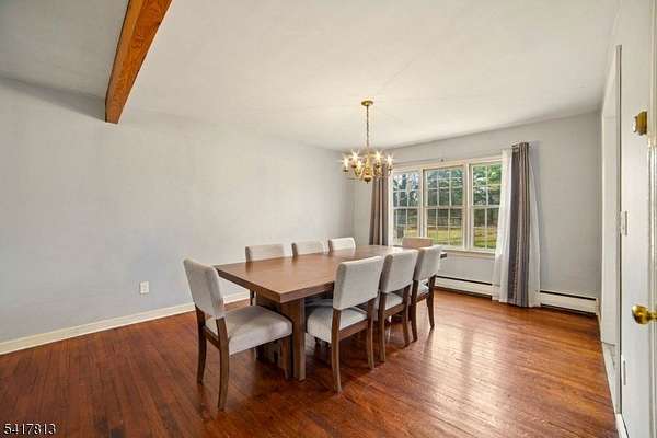 Nestled in the highly desirable town of Readington Twp and just 49 miles west of NYC, this charming home offers 2.21 gorgeous, level acres with scenic views overlooking Round Valley Mountain. Septic replaced in 2017. Surrounded by natural beauty, the property provides a peaceful setting while remaining conveniently close to everyday amenities and recreation. The home features hardwood flooring throughout the first floor, adding warmth and character. A remodeled eat-in kitchen showcases stainless steel appliances, ample cabinetry, and space for casual dining. The formal dining room is perfect for hosting gatherings, while the inviting living room boasts a stunning wood beam ceiling and a cozy wood-burning fireplace, creating the perfect ambiance. Two bedrooms and a beautifully remodeled full bathroom are located on the first floor, offering comfort and convenience. Upstairs, an additional flexible space can serve as an optional bedroom, office, or creative retreat. A bright sunroom provides the perfect spot to relax and enjoy the surrounding views year-round. Generous closet space throughout adds to the home's functionality. Outdoor living shines with a covered front porch, spacious deck, and an above-ground pool, all set with a backyard designed for entertaining or simply enjoying the serene landscape. Located near Round Valley Reservoir for hiking, biking, fishing, and boating, as well as Stanton Ridge Golf & Country Club, NYC train station, shopping, dining, and highways