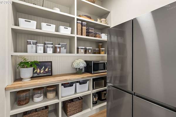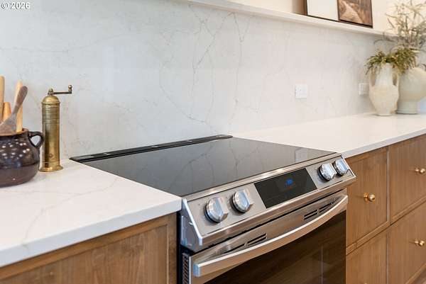 - Dishwasher, Free Standing Range, Free Standing Refrigerator, Island, Pantry, Plumbed For Ice Maker, Quartz, Range Hood, Stainless Steel Appliance, Wine Cooler