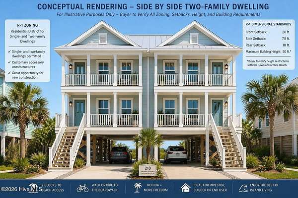 Opportunity Knocks - Just 2 Blocks to the Beach! Welcome to 210 Greenville Avenue, a prime homesite located just two blocks from the ocean and minutes from the Carolina Beach Boardwalk. This 50' x 125' lot (.143 acres) offers a rare opportunity to build your dream coastal retreat, vacation getaway, or investment property in one of Carolina Beach's most walkable and desirable areas. Zoned R-1 Residential, this property is intended for single- and two-family dwellings, along with customary accessory uses and structures. Current Town standards generally reflect a 20-foot front setback, 7.5-foot side setbacks, 10-foot rear setback, and a maximum building height of 50 feet, subject to buyer verification of all zoning, flood, utility, and building requirements. With no HOA, this parcel offers added flexibility and fewer restrictions for builders and buyers alike. Enjoy the best of island living by biking to the beach, strolling to local restaurants, exploring the Greenway, or catching live music at the boardwalk. Whether you're ready to build now or secure a lot for future development, this is a compelling opportunity in the heart of Carolina Beach. 50' x 125' homesite (.143 acres) Survey on hand Just 2 blocks to beach access R-1 zoning allows single- or two-family residential use 20' front, 7.5' side, and 10' rear setbacks Maximum building height of 50 feet No HOA Close to the beach, boardwalk, Greenway, shops, and dining