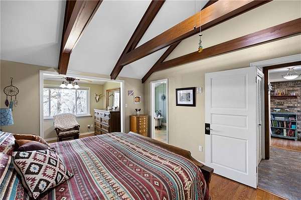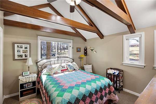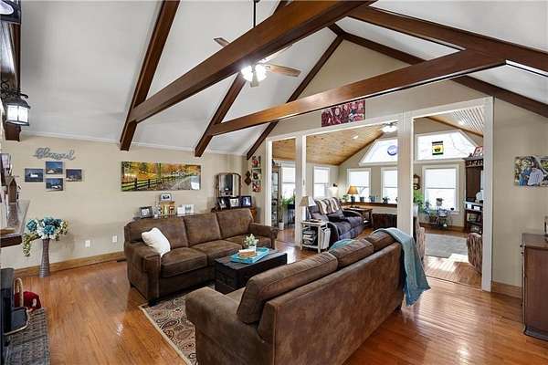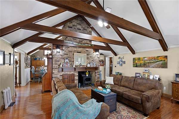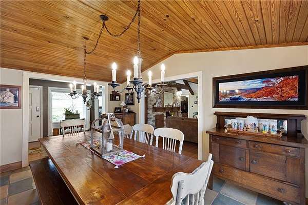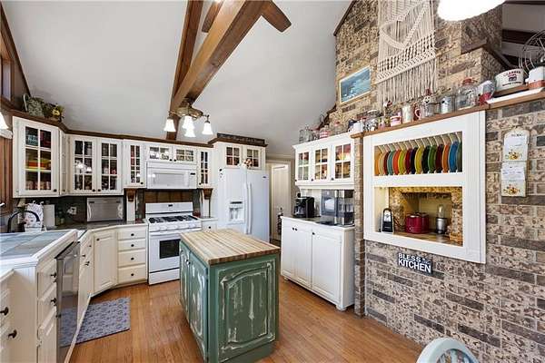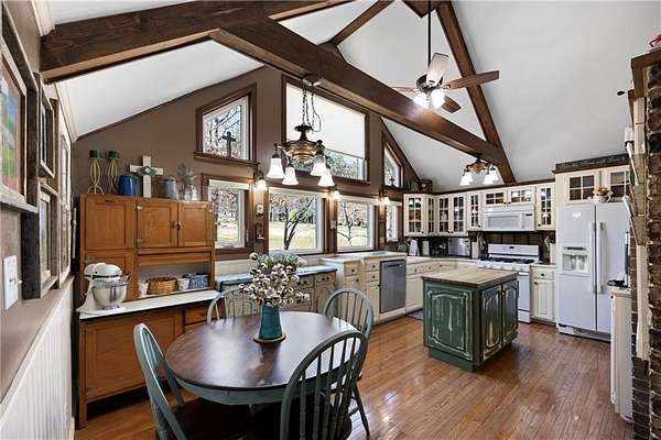 This pristine front yard sets the tone for your own private paradise. From the moment you step inside, the warmth and craftsmanship of this beautiful home are unmistakable. Floor-to-ceiling Andersen windows frame uninterrupted views, while soaring ceilings, exposed wood beams, and hardwood floors create an inviting, timeless atmosphere. The classic kitchen adds to the home’s enduring character, making every guest feel welcome.