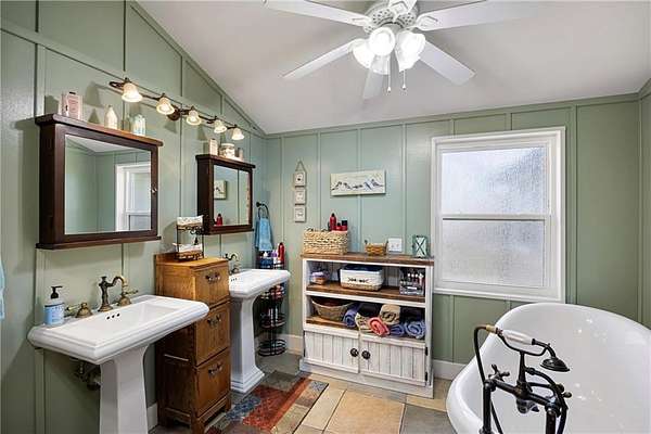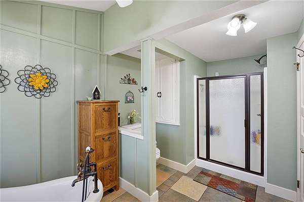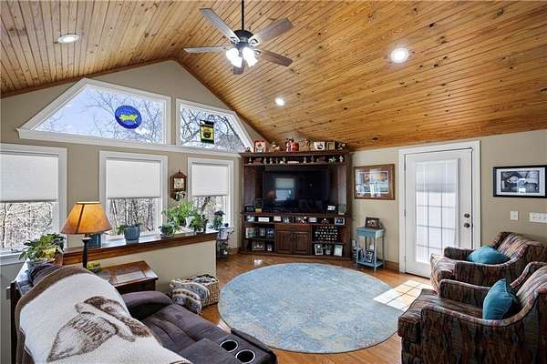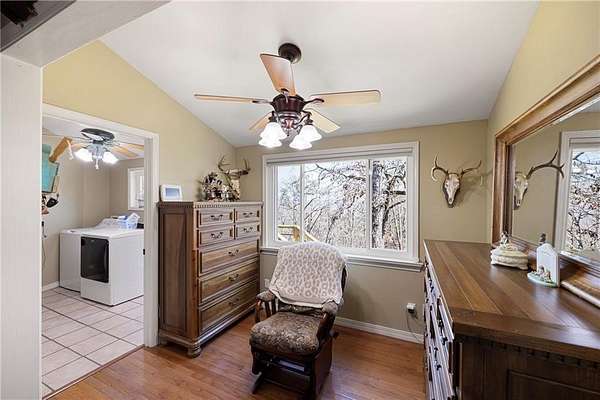 - Built-Ins, Cathedral Ceiling, Ceiling Fans, Ceramic Tile Counters, Eat-in-Kitchen, Ice Maker Connection, Pantry, Split Floor Plan, Woodstove