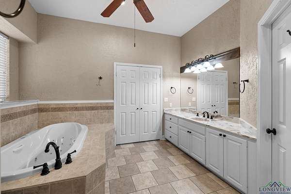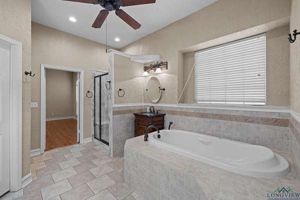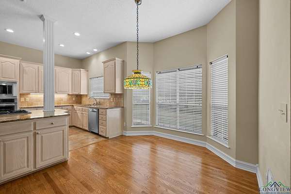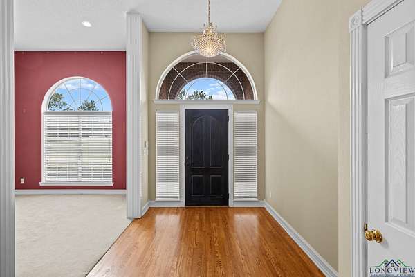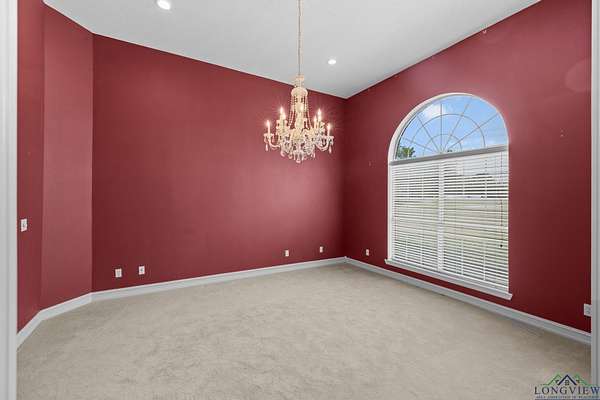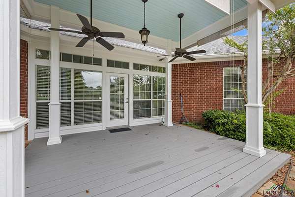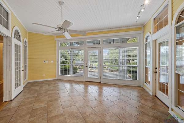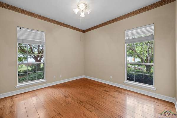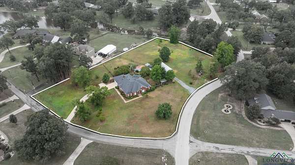 This beautiful 3/3.5/2 home has 3100 sf, sits on 2.94 acres and is located in Honeysuckle Farms in sought after Hallsville ISD. The home features two primary bedrooms, a large sunroom, spacious kitchen and a stunning backyard. In both primary bedrooms, you will find a large en suite which features a soaker tub, walk-in closet and a tiled walk-in shower. One primary bedroom includes an extra sitting area that could function as an office. The kitchen features state-of-the-art stainless appliances (2 ovens), an oversized Island, two pantries and a breakfast area. In the sunroom, you will find plenty of room to entertain family/friends and provides a serene view of the backyard. In the backyard, you will find beautiful, extensive landscaping which includes rose bushes and a Koi pond (not currently stocked). There is also a shop with a half bath and A/C and a RV cover with electrical hook-up. This home comes with an extra lot that could be fenced to provide a large play area for pets and/or kids. Newer HVACs, water heater and Briggs & Stratton Generator. There is a private well for watering the lawn and community water supplies the home. This home has so much to offer!