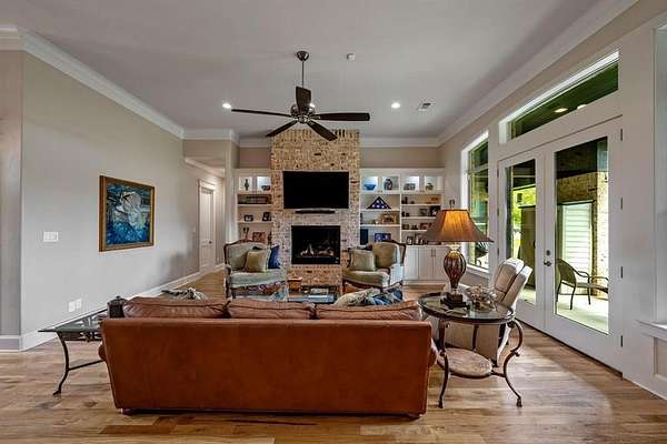 The gourmet kitchen showcases hand-made custom tile backsplash, large pantry, Samsung appliances, including double self-cleaning convection ovens, five-burner gas cooktop, dishwasher, glass-front lighted cabinetry, and under-cabinet lighting. The living area features a gas fireplace with custom built-ins, and accent lighting. A secondary bedroom includes built-in desk, cabinetry, shelving, and walk-in closet.