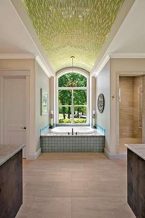 The private primary suite is a true retreat, with a secluded sitting room ideal for reading or home office, dual walk-in closets, and spa-inspired bath featuring tiled barrel ceiling, oversized soaking tub, large walk-in shower with stationary and handheld heads, dual vanities, and private water closet.