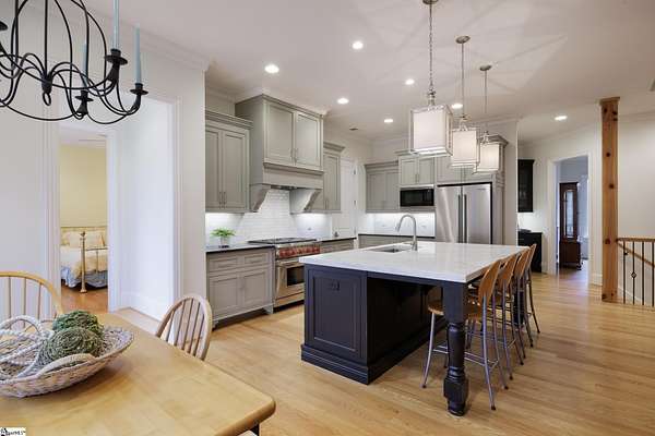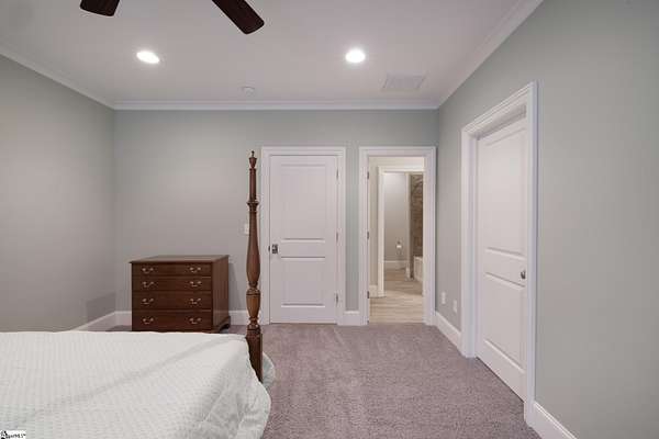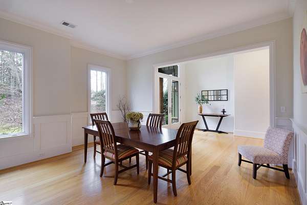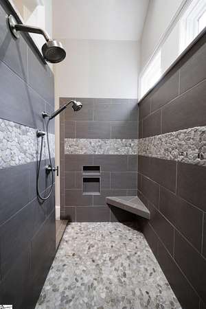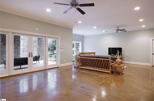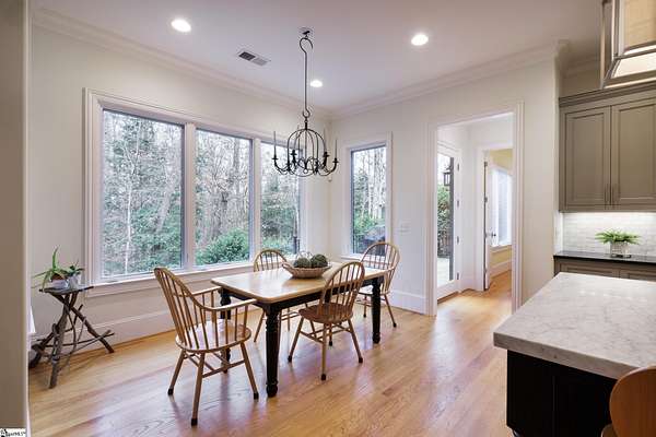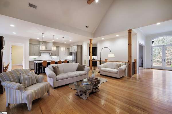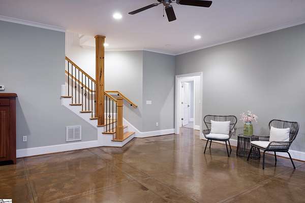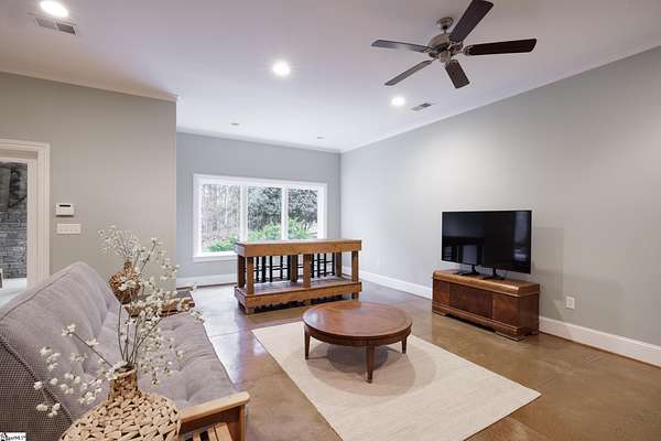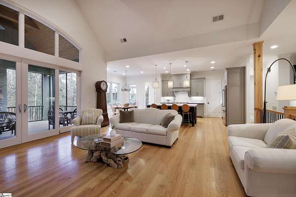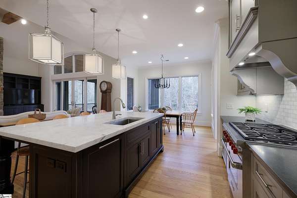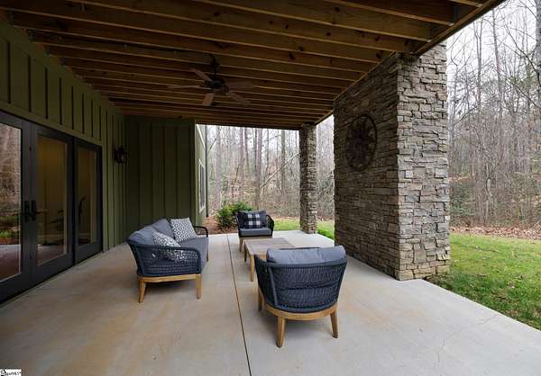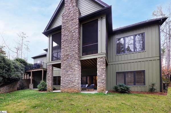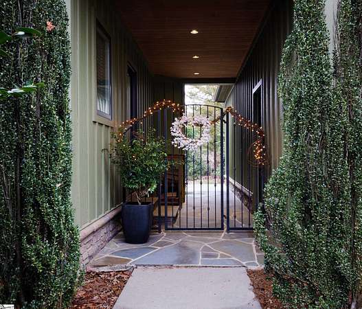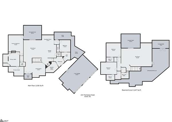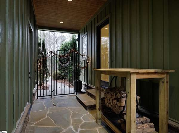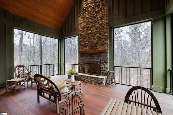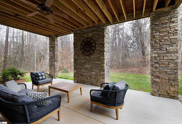 For more information on 210 Thompson Road, Call/Text Melissa Morrell, Greenville's Agent 24/7 at 864-918-1734. A rare blend of privacy, craftsmanship and convenience, this ONE OWNER custom home by Peery Homes sits on 2.7 beautifully wooded acres in a prime location just minutes from Five Forks Simpsonville and Greer. Zoned for award-winning schools and FREE FROM HOA restrictions, the setting offers the feel of a secluded mountain lodge while remaining close to everyday amenities. The thoughtfully designed floor plan is both hard to find and easy to love. The main level features true one-level living with an open layout ideal for everyday comfort and entertaining with a center wood-burning fireplace with floor to ceiling stone in the Great Room. This area opens up to the kitchen with its center island, furniture-style cabinetry, gas cooktop and huge walk in pantry. The primary suite is a standout, offering a two-sided gas fireplace and a spa-like bathroom with a soaking tub, dual vanities, a spacious walk-in shower with dual entry, and a generous walk-in closet. An additional guest suite on the main level provides flexibility for visitors or multi-generational living. And for guests there's a powder room as well. The walk-out lower level expands the home's living space with a sprawling recreation area highlighted by custom stained concrete floors, two bedrooms with generous closets connected by a true Jack-and-Jill bath, and nearly 1,000 square feet of unfinished storage, perfect for seasonal items, a workshop or future expansion with direct access to the rear grounds and a patio. The outdoor living is just as impressive. A charming stone-paver breezeway leads to a wrap-around deck and a stunning vaulted screened porch featuring one of the home's three fireplaces, an ideal spot to relax and enjoy the peaceful surroundings. Functionality shines with a dedicated mudroom and laundry room with tiled floors and seamless access through the breezeway to the three-car garage. This is a home that offers space, privacy, and exceptional design, without sacrificing location or convenience.