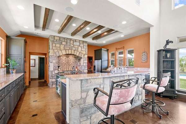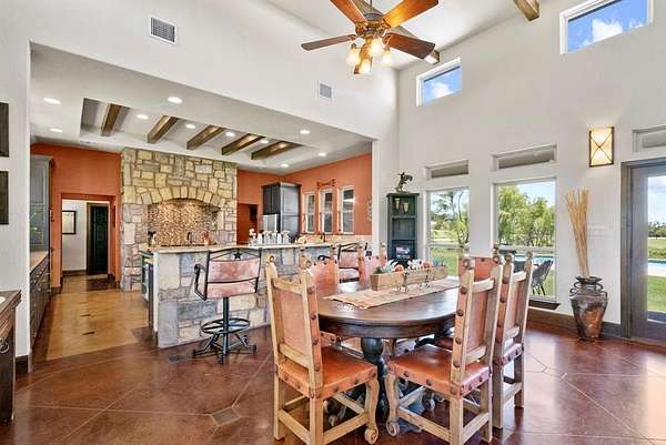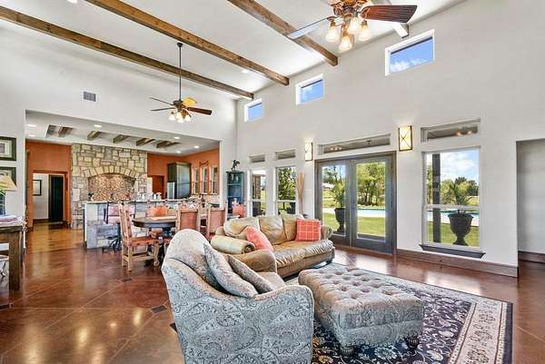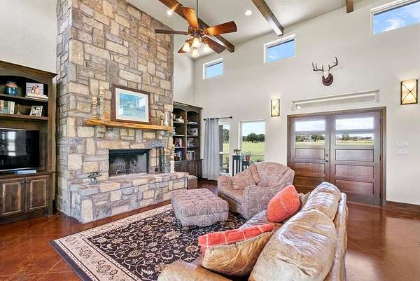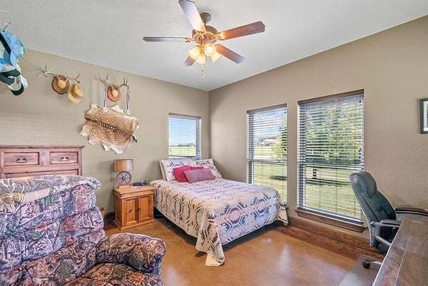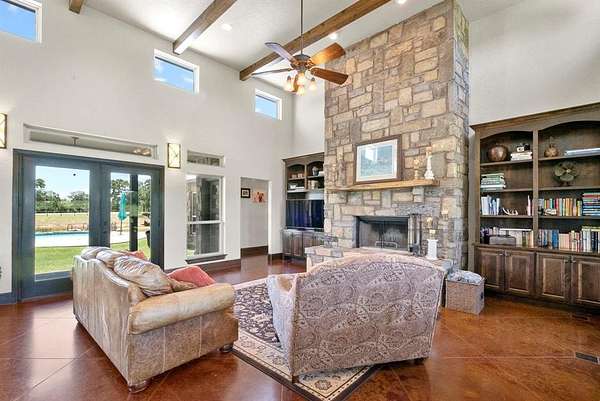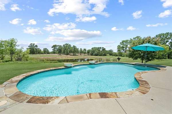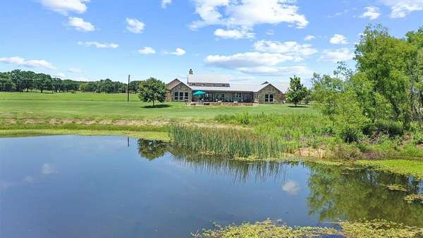 Stunning custom home in Brock ISD! This beauty features high ceilings, crown molding, scored concrete floors, sound system, handmade exterior doors, 5oo gallon underground propane tank and much much more! High quality finishes and attention to detail throughout including an eight inch floating foundation. The kitchen is a true chef's delight and blends masterfully into the living room which is anchored by a magnificient fireplace! Relax on the covered back porch to enjoy the view over the pool as well as the gorgeous tank. Lounge on the front porch and gaze out over a beautiful pasture! (12 of the 13 acres is Ag exempt). This quiet, peaceful gated community boasts a serene lake and private access to the Brazos River. A must see for anyone seeking country lifestyle enhanced with quality and beauty!
