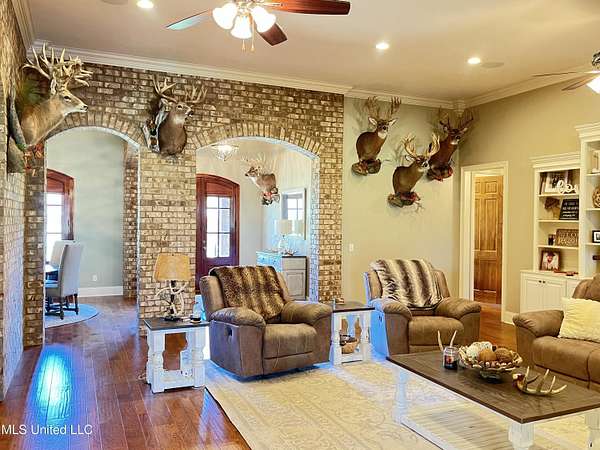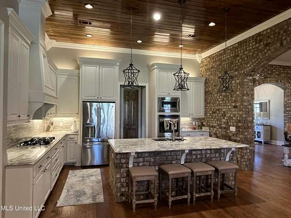 Welcome to 210 White St., where luxury meets comfort in this stunning residence! This meticulously designed custom-built home will not disappoint! The open living, kitchen, keeping and dining areas create an inviting atmosphere, perfect for entertaining or family gatherings. The living room, dining room, keeping room, and kitchen feature beautiful stained beaded wood ceilings, adding warmth and character to the home. Brick archways and accent walls create inviting focal points, seamlessly blending classic design with modern amenities. The home also features eight foot solid wood interior doors that flow well with ceiling heights and the overall quality of the home. Step into elegance with exquisite Italian marble countertops throughout the kitchen, featuring a huge Italian marble island with a sink that serves as both a functional workspace and a stunning centerpiece. Extensive cabinetry offers ample storage space and showcases custom finishes. The raised ceilings enhance the spacious feel, while the vaulted trey ceiling, lined with stained wood, in the primary bedroom adds a unique touch of sophistication. The primary bathroom is a true sanctuary, designed for both luxury and functionality. It features a double vanity with beautiful granite countertops, providing ample space for daily routines. The elegant fixtures and custom cabinetry enhance the overall aesthetic, ensuring a blend of style and practicality. There is a stunning custom tiled walk-in shower, enclosed by sleek glass walls. This spacious shower offers a spa-like experience, with high-end finishes that create an inviting atmosphere perfect for unwinding after a long day. The thoughtful design allows for plenty of natural light to flow in, enhancing the serene ambiance of the space. Right off of the primary bathroom is a huge walk-in closet with custom built-ins. This home also features a large laundry room equipped with custom cabinetry, a convenient folding area, a sink, and a spacious pantry for all your culinary storage needs. The dedicated office boasts ample cabinet space and a stylish granite desktop, offering the perfect workspace for productivity. Step outside to discover a fantastic entertaining space, highlighted by a spacious back porch equipped with three large ceiling fans for comfort on warm days. This outdoor oasis includes a built-in grilling area, perfect for hosting summer barbecues, and just off the porch is a cozy fire pit, ideal for gathering with friends and family under the stars. Enjoy the serene beauty of your own private pond, complete with a charming fountain and stocked with catfish-ideal for fishing or simply enjoying the view. The seller has just installed a brand new sea-wall around the entire perimeter of the pond. The exterior of the home showcases custom brick and mortar work, accented by elegant iron railings on both the front and rear porches. Storage is a breeze with a four-car garage that includes an additional heated and cooled storage space, featuring a convenient roll-up door to the rear of the home. For added peace of mind, a storm shelter is located beneath the garage, ensuring safety during inclement weather. This home is equipped with tankless water heaters, and a whole-house Cummins generator for reliable power during outages, along with a full sound system and a comprehensive camera system located both on the interior and exterior of the home, ensuring convenience and security. This property is not just a magnificent home; it's a lifestyle. Don't miss the opportunity to make this dream home yours! Schedule a showing today!