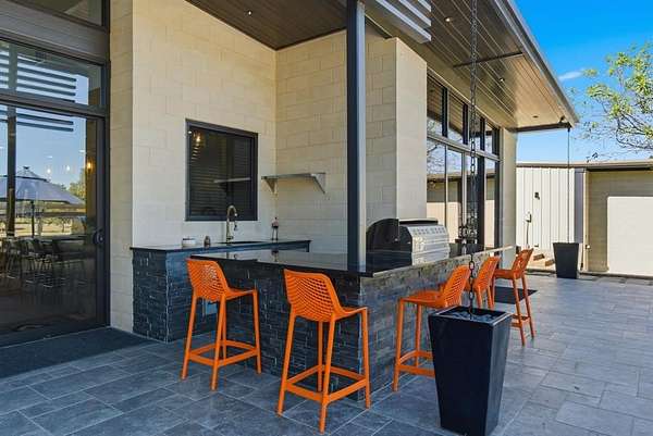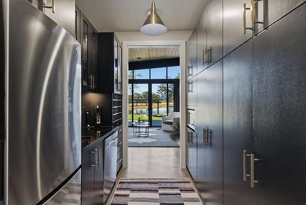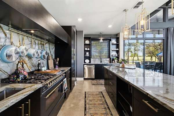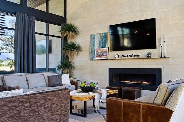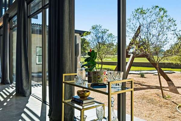 Inside, you'll find an open-concept design with striking architectural details, warm textures, and custom finishes throughout. The kitchen is a showpiece -- gorgeous quartzite counters, custom cabinetry designed to display your finest crystal, and a large island ideal for entertaining. The inviting living spaces are centered around beautiful fireplaces and seamless indoor-outdoor flow.